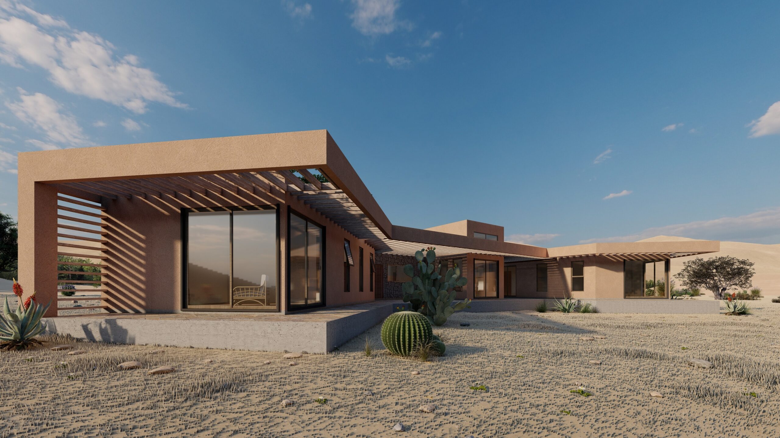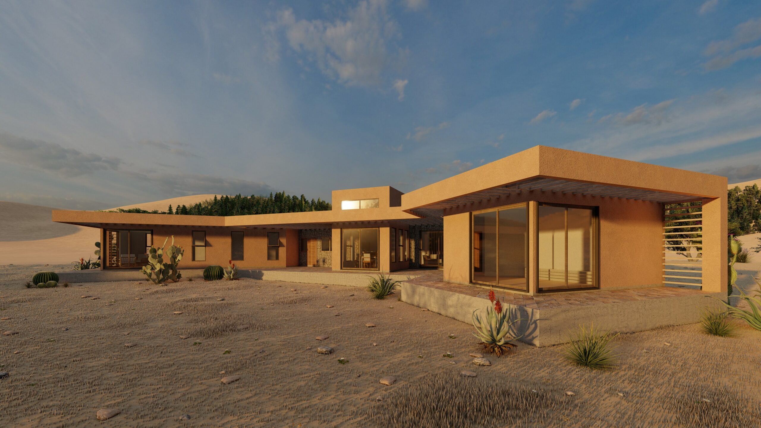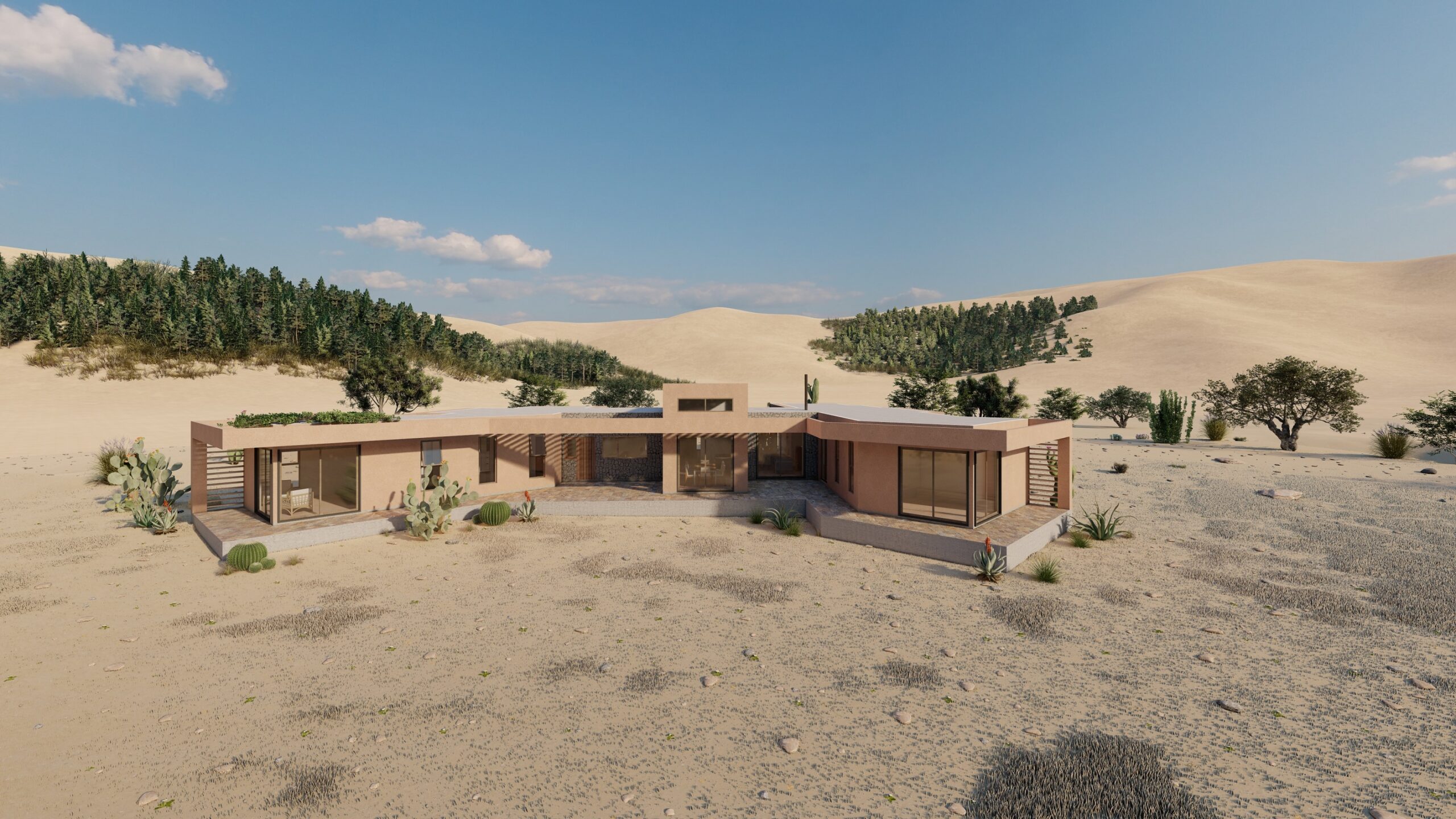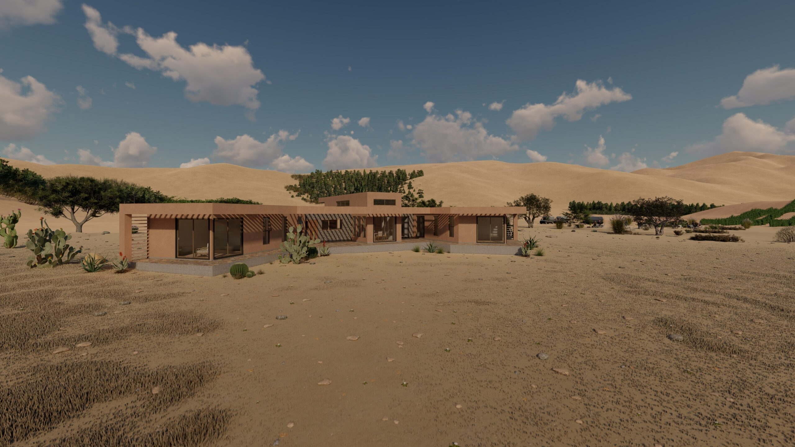Pensada para dos familias, la vivienda se organiza en torno a un núcleo central que articula los espacios comunes, promoviendo la convivencia. Los volúmenes laterales, como extensiones en forma de brazos, albergan los dormitorios de cada familia, asegurando privacidad y comodidad. Este enfoque logra un balance entre funcionalidad y estética, ofreciendo un refugio que respira el espíritu del desierto.