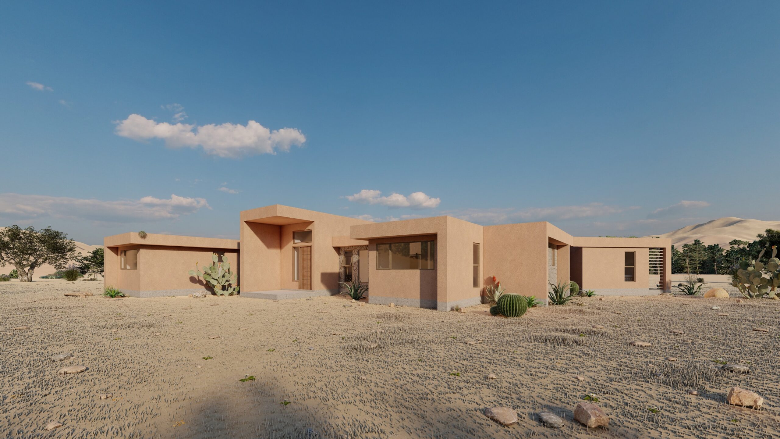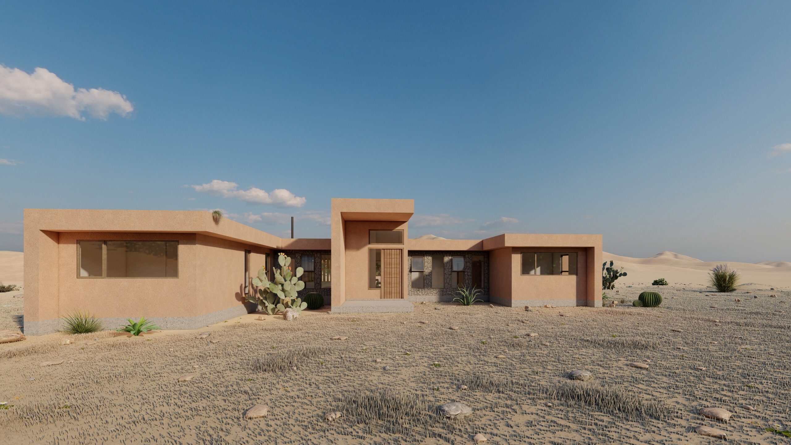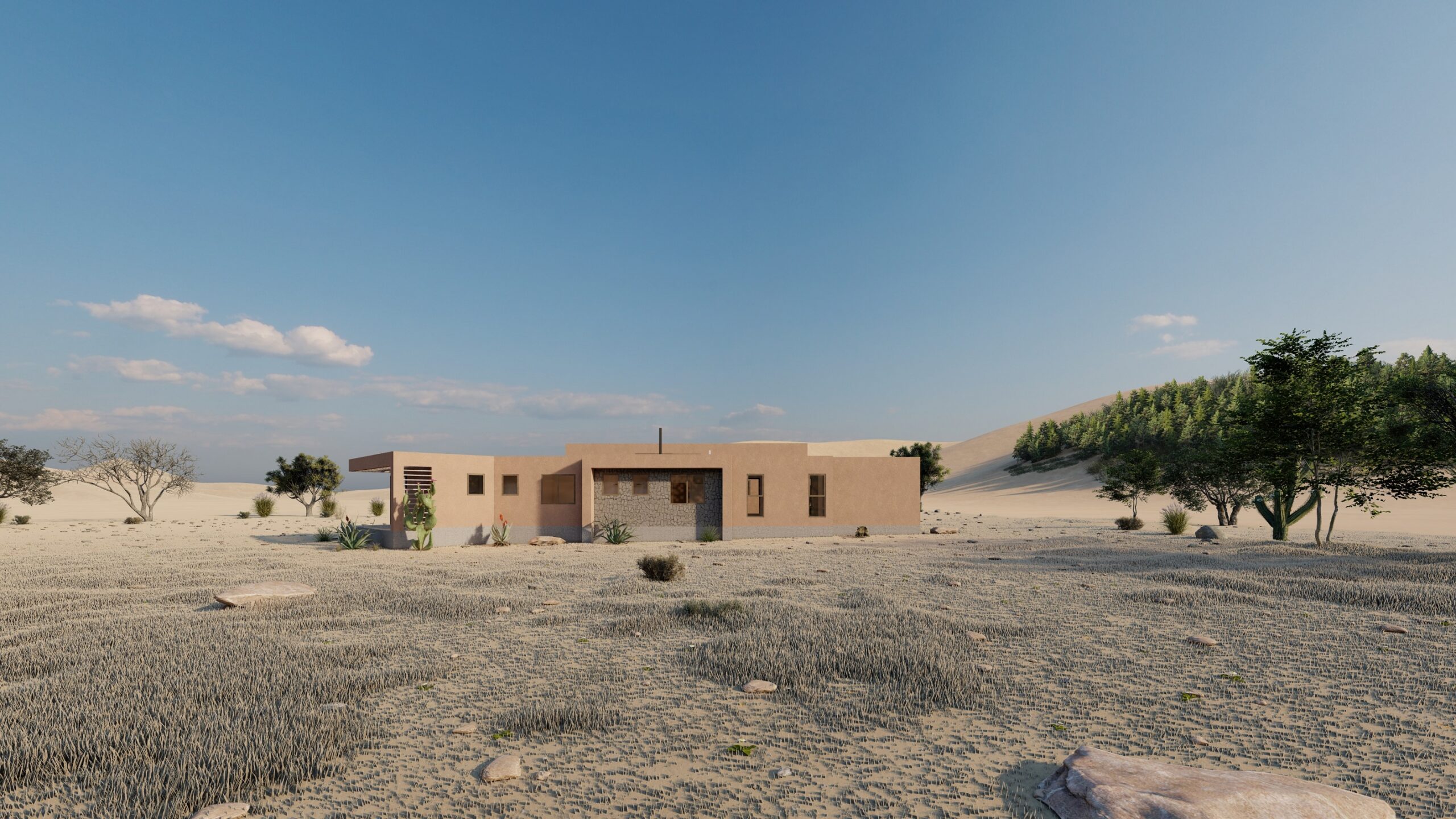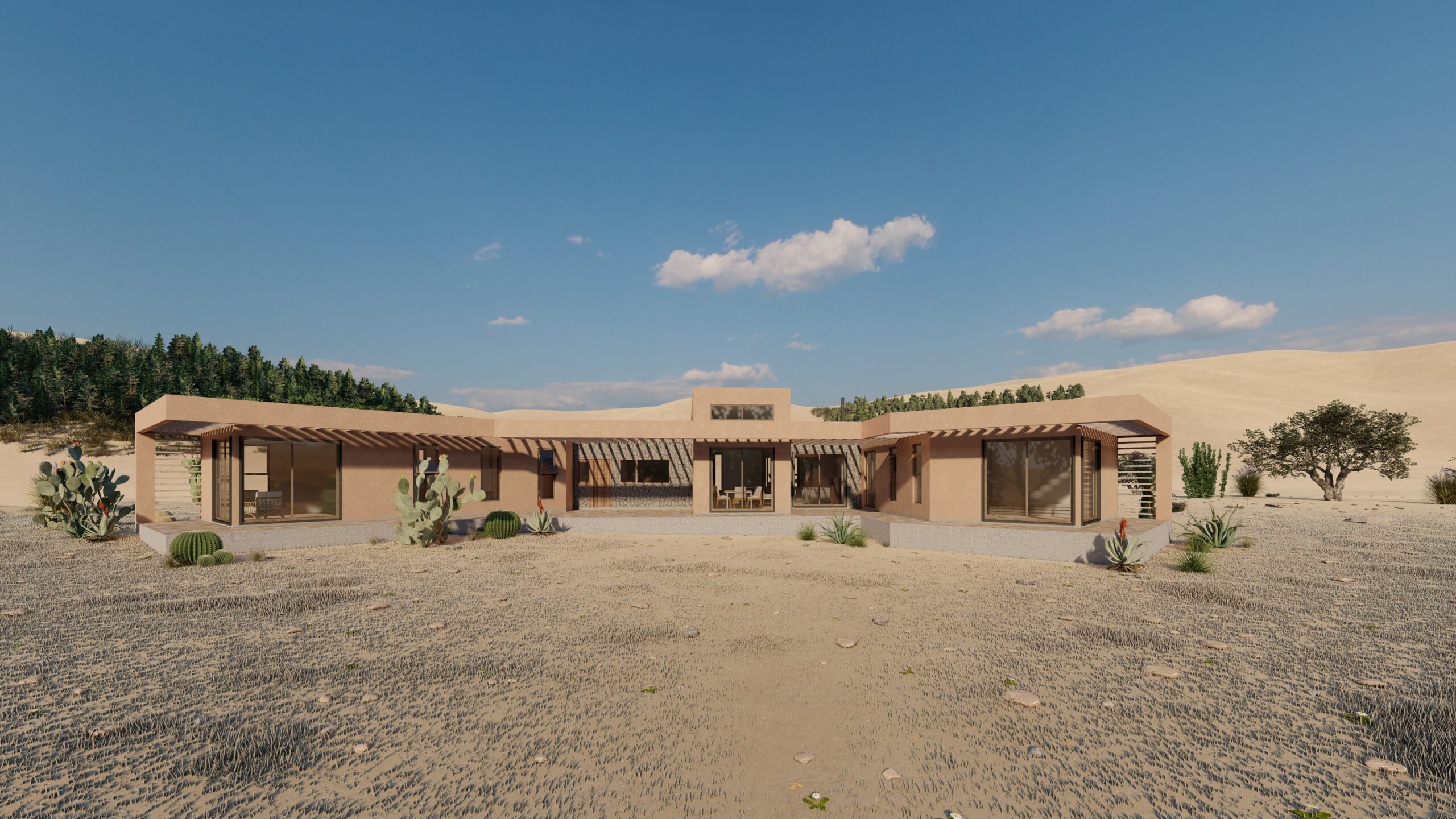 Pensada para dos familias, la vivienda se organiza en torno a un núcleo central que articula los espacios comunes, promoviendo la convivencia. Los volúmenes laterales, como extensiones en forma de brazos, albergan los dormitorios de cada familia, asegurando privacidad y comodidad. Este enfoque logra un balance entre funcionalidad y estética, ofreciendo un refugio que respira el espíritu del desierto.