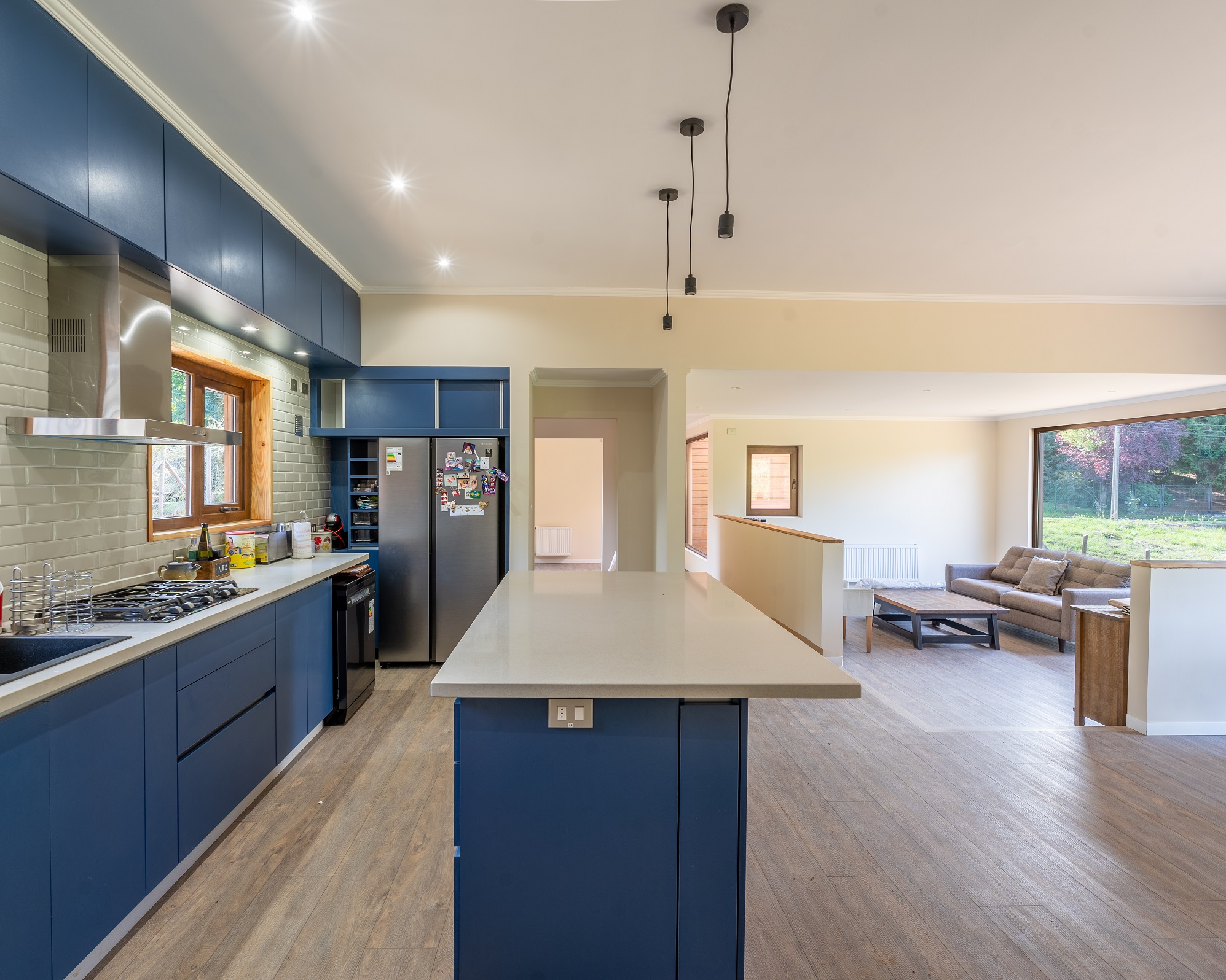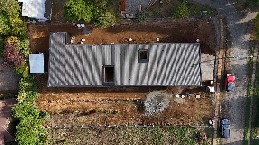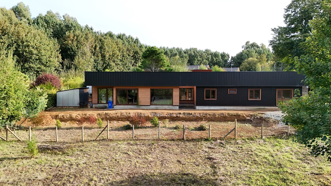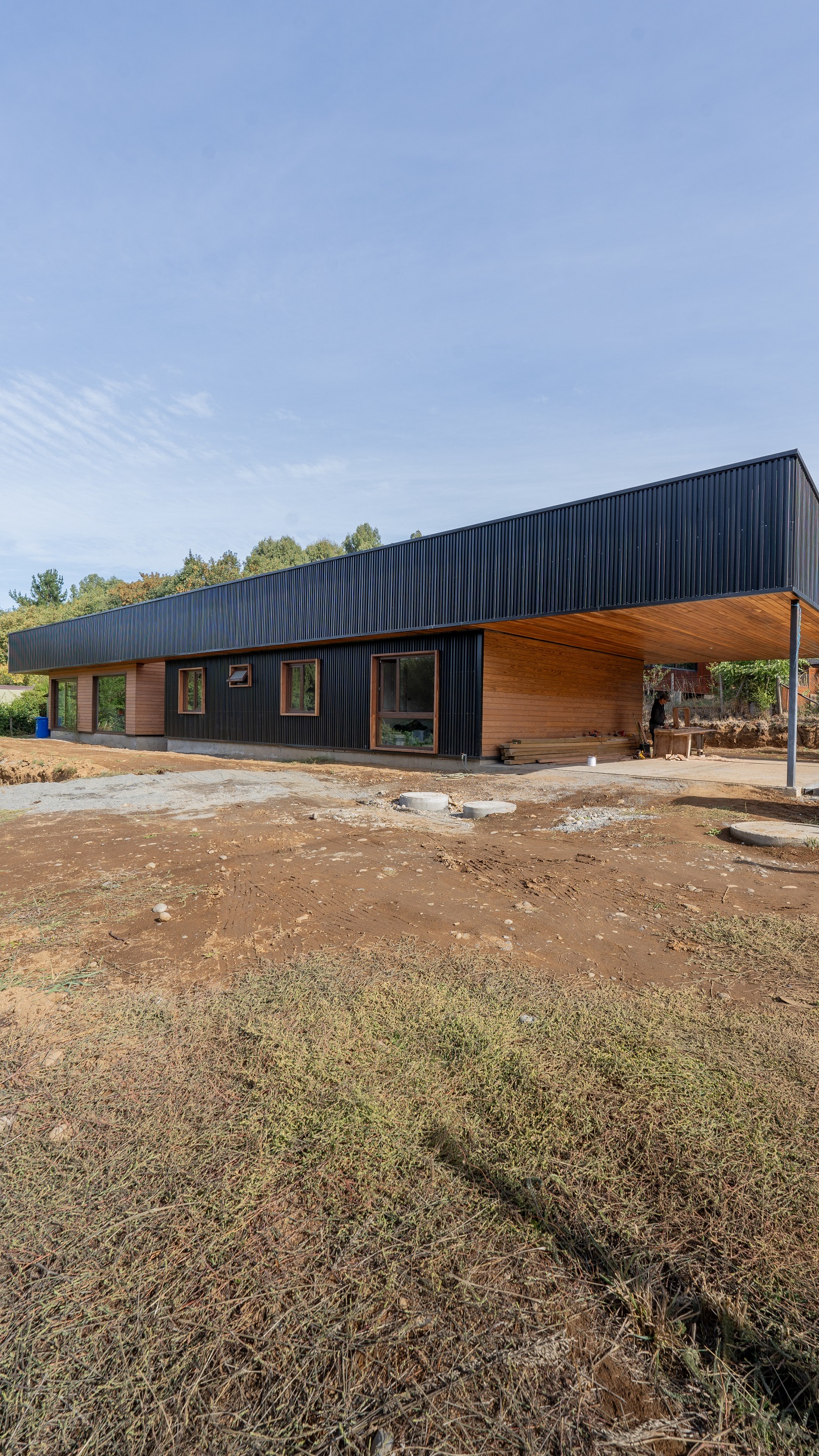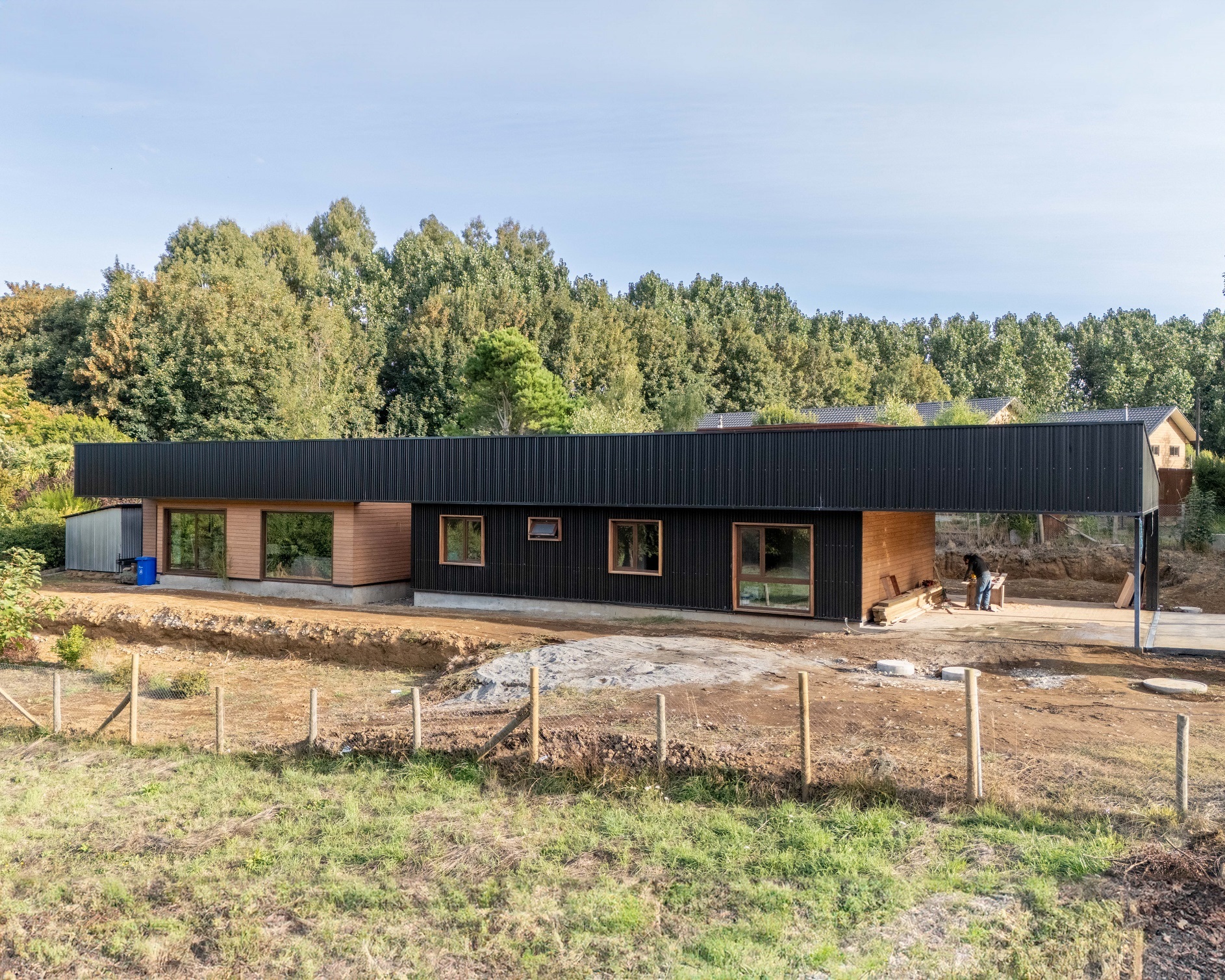 Los materiales seleccionados reflejan un enfoque práctico y estético, con zinc prepintado negro en las fachadas para minimizar la mantención y aportar un carácter robusto, combinado con madera termotratada que resalta su calidez natural y ofrece un excelente desempeño frente al clima del sur de Chile. Los grandes ventanales permiten una integración visual con el exterior, generando ambientes luminosos y una conexión fluida con el futuro jardín del proyecto.