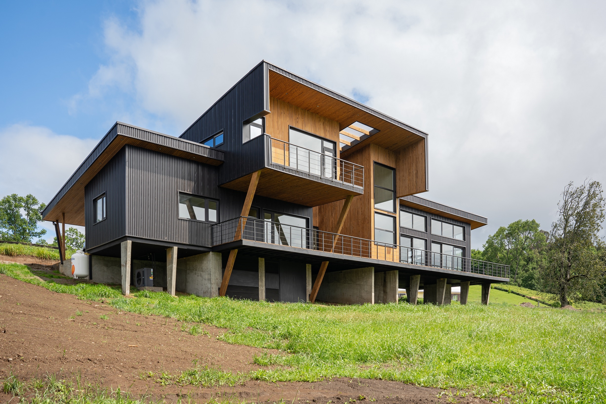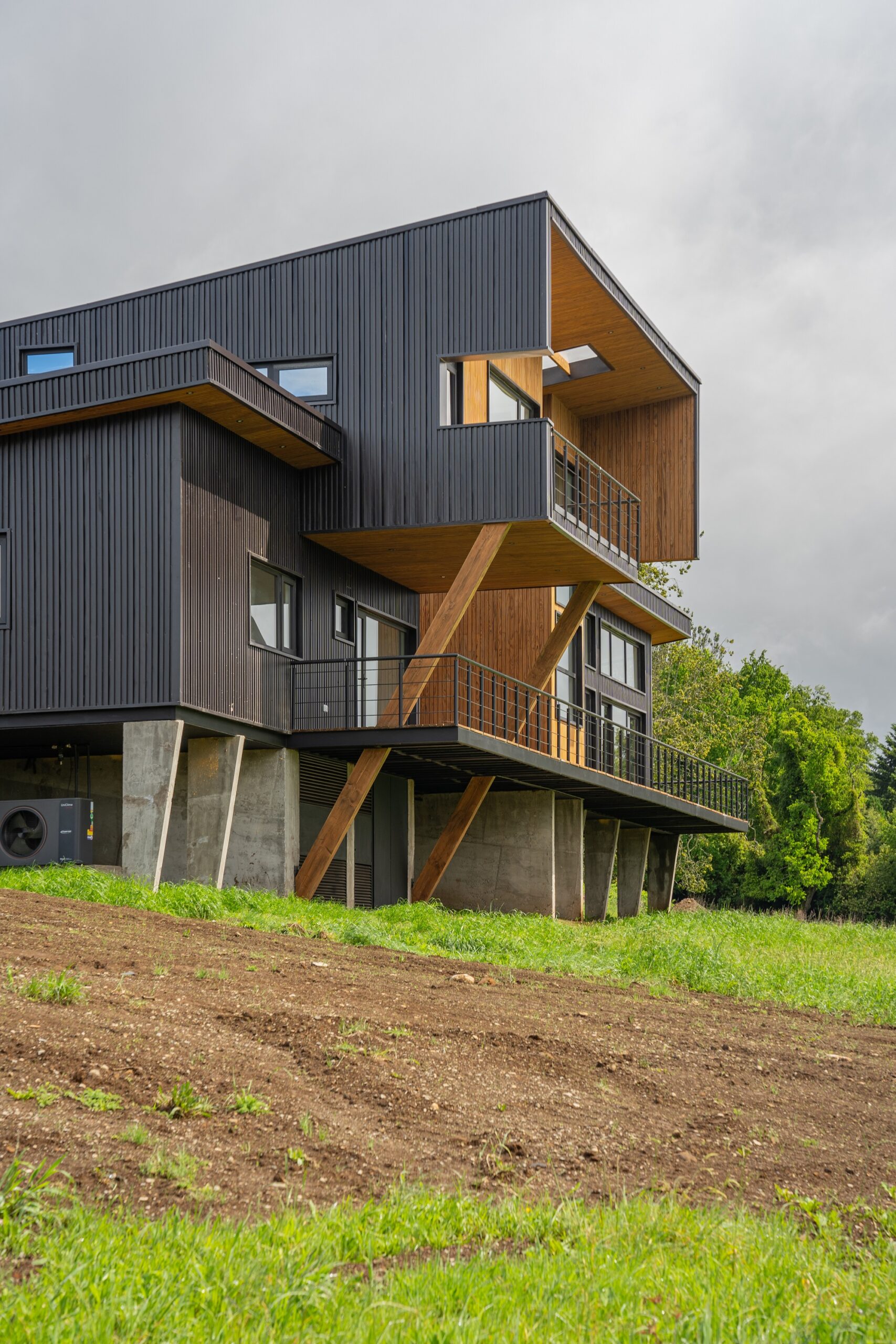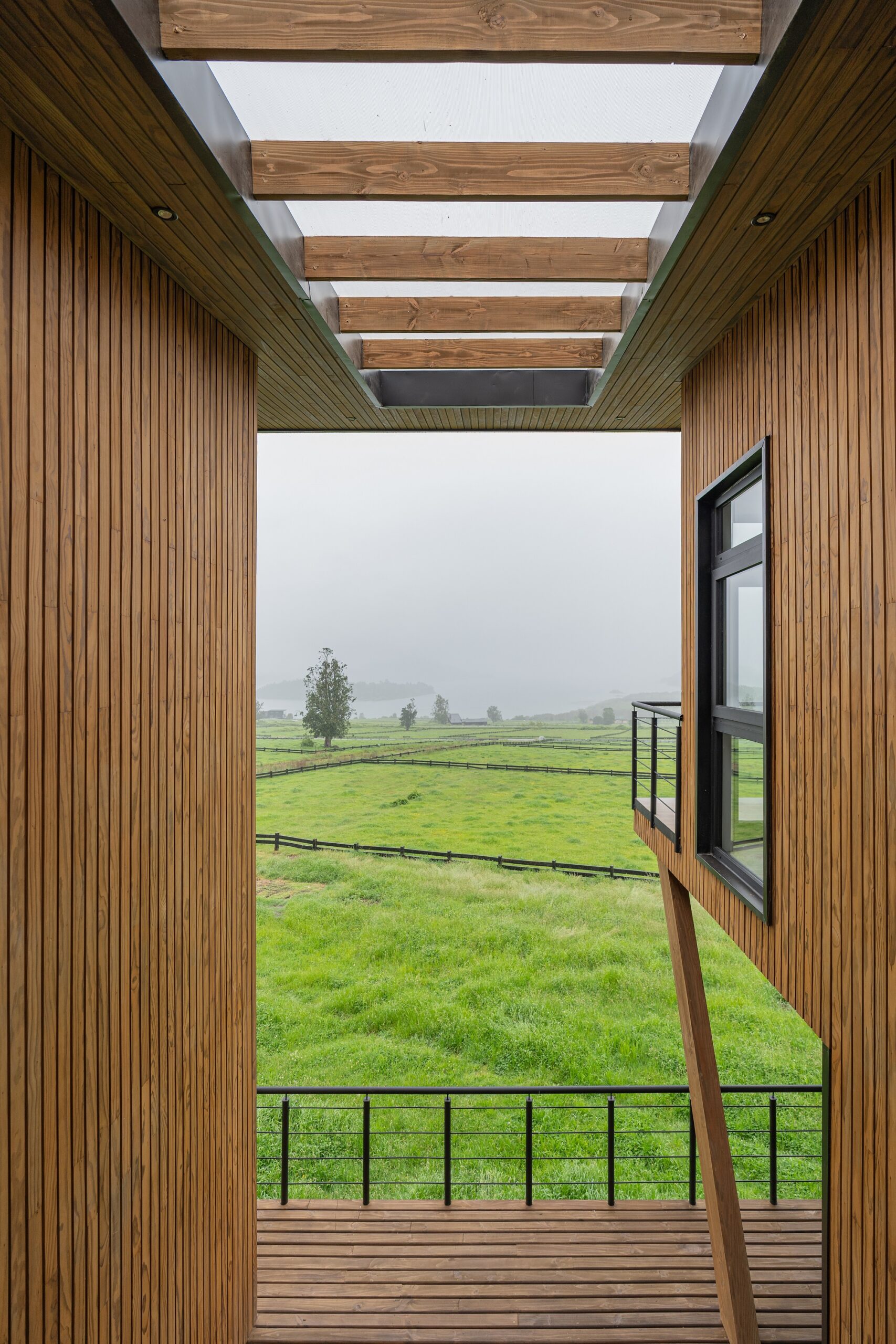 Su diseño aprovecha al máximo las vistas hacia el imponente lago y los volcanes Villarrica y Mocho Choshuenco, posicionando la vivienda de manera diagonal para capturar de forma óptima su entorno natural.