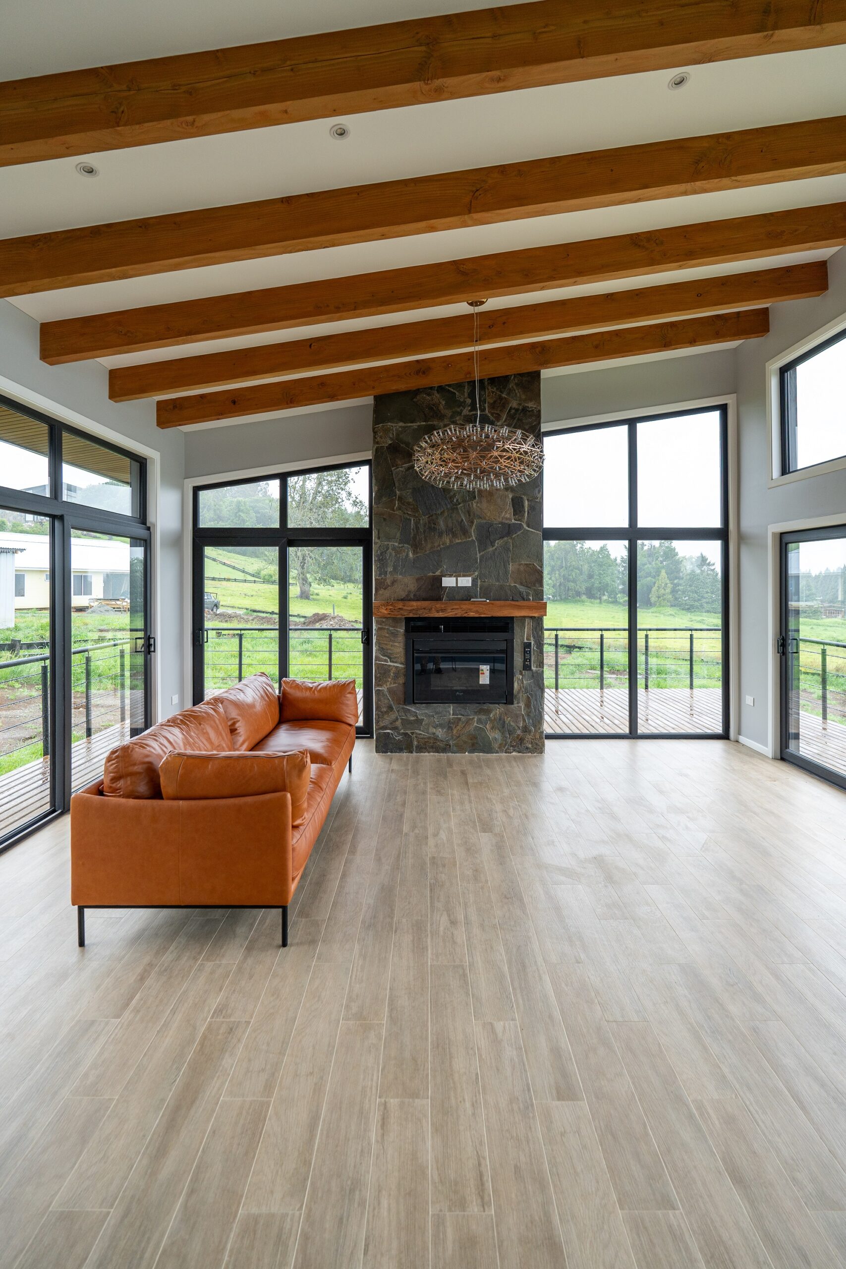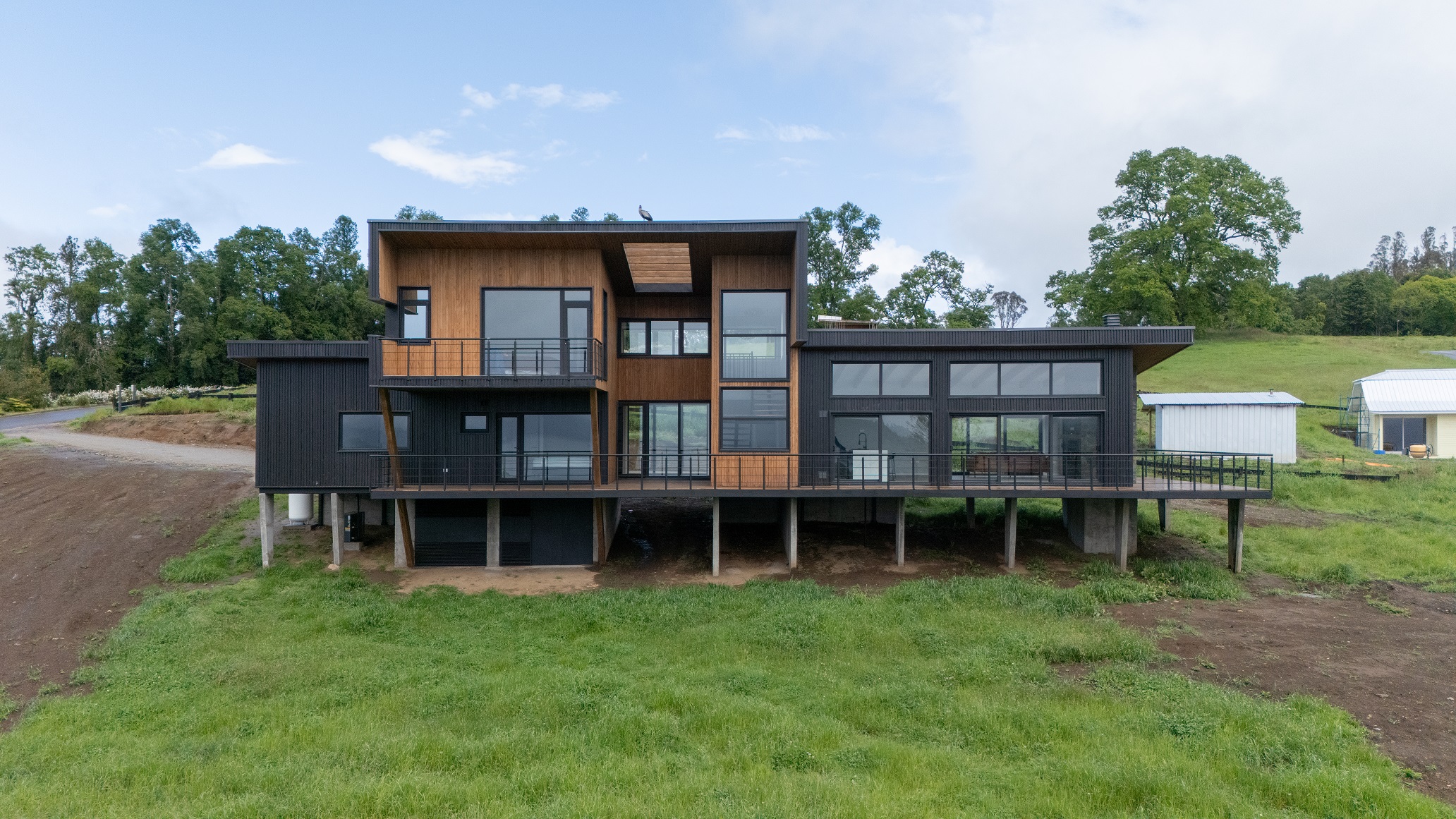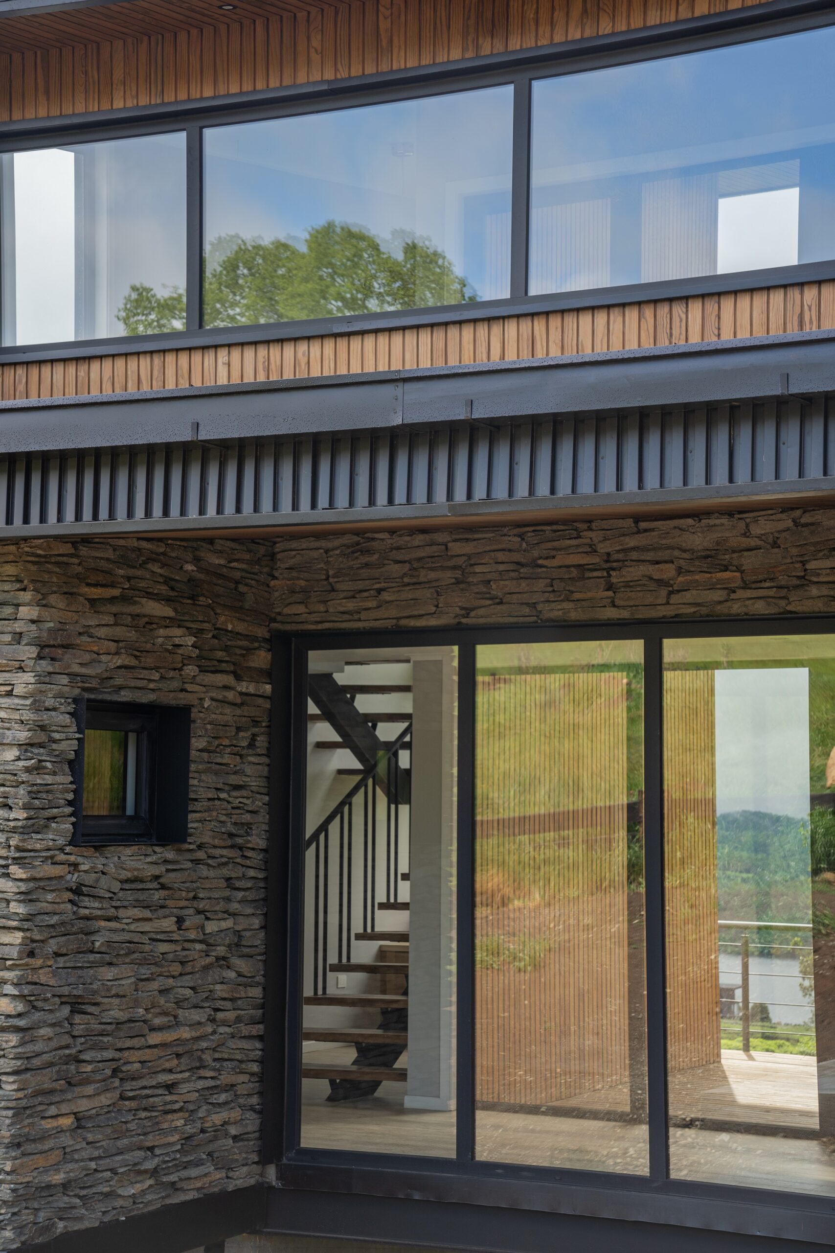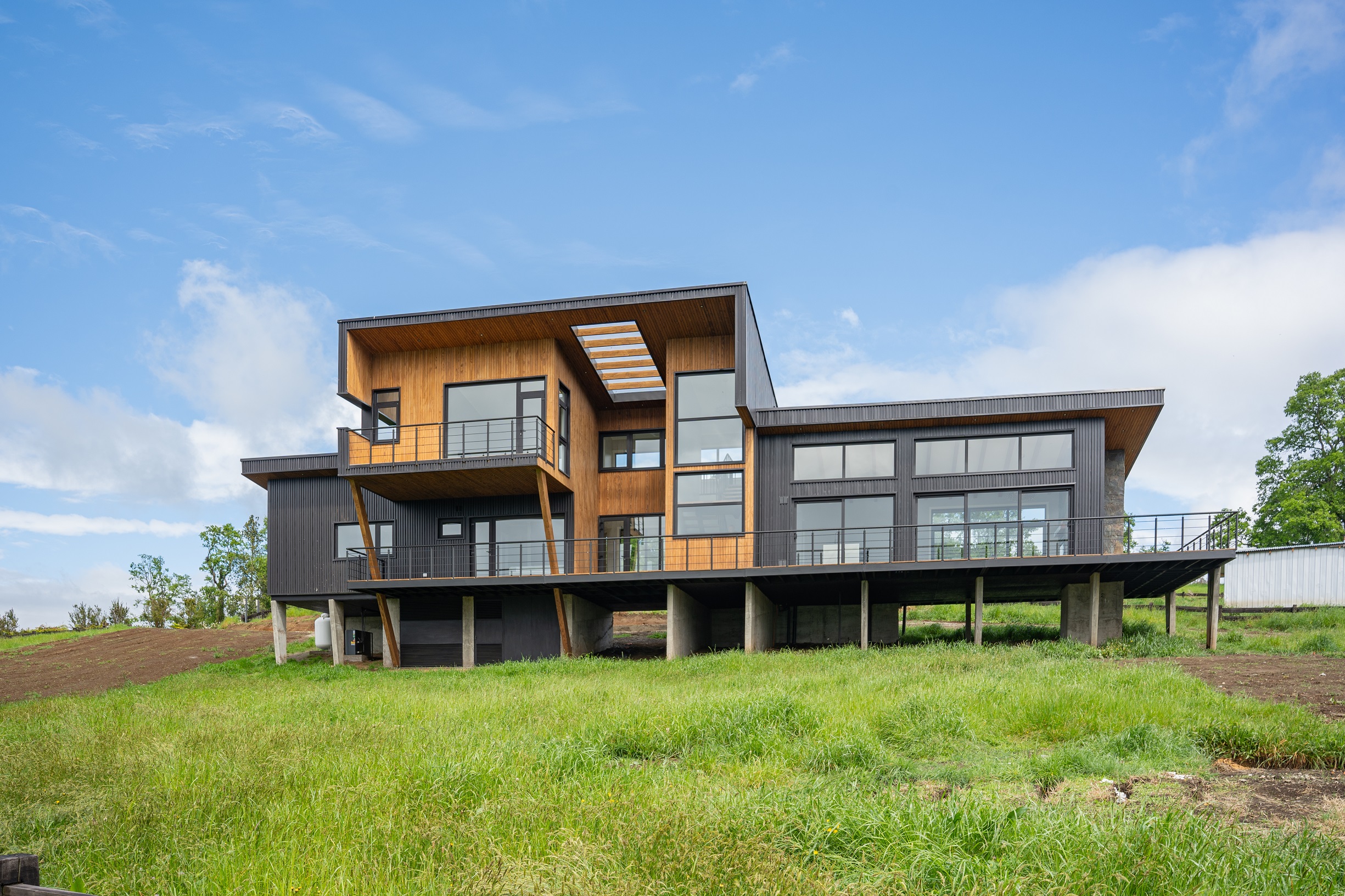 Su diseño aprovecha al máximo las vistas hacia el imponente lago y los volcanes Villarrica y Mocho Choshuenco, posicionando la vivienda de manera diagonal para capturar de forma óptima su entorno natural.