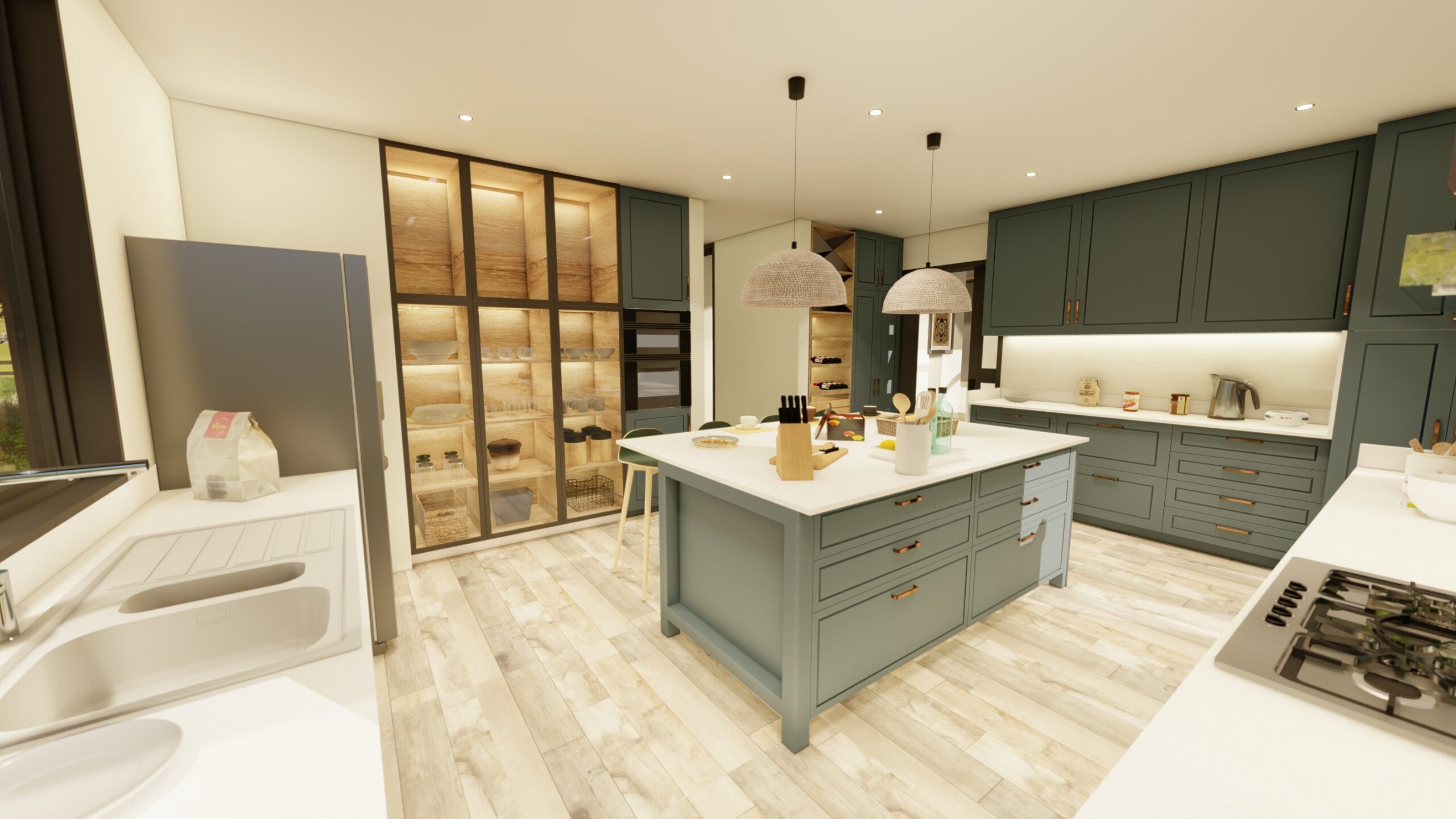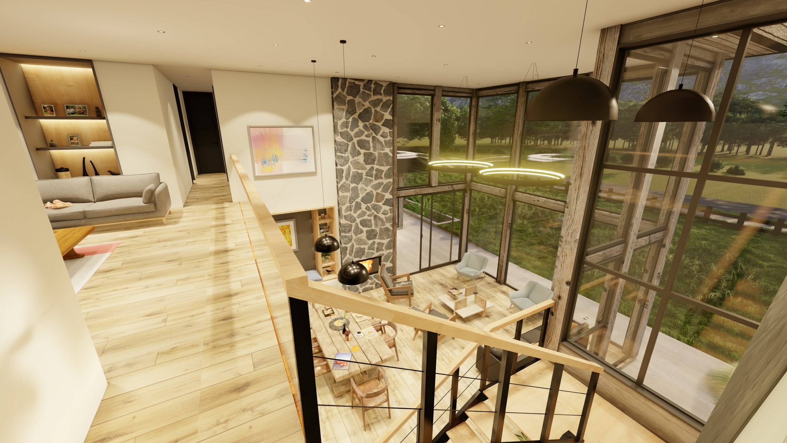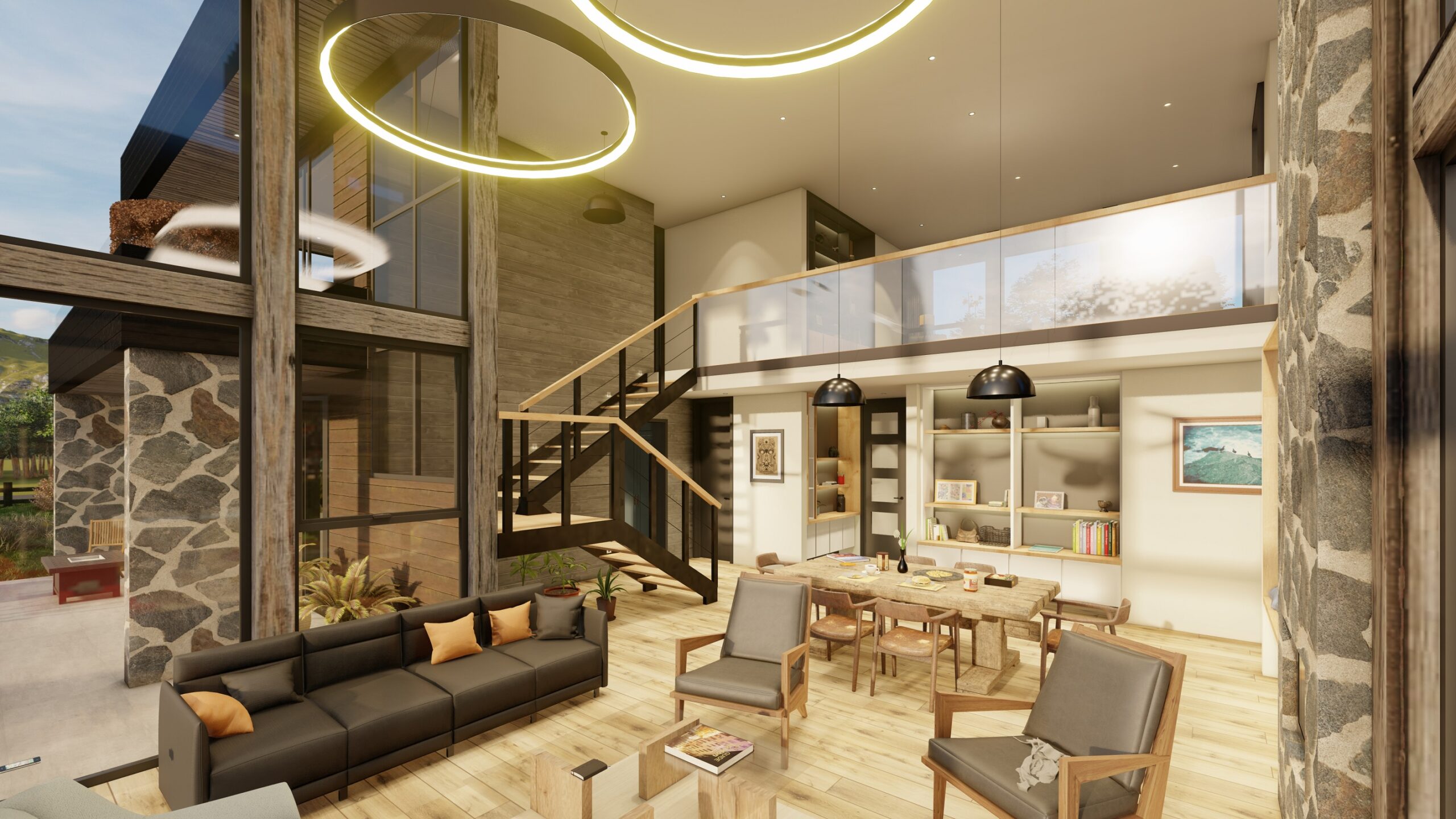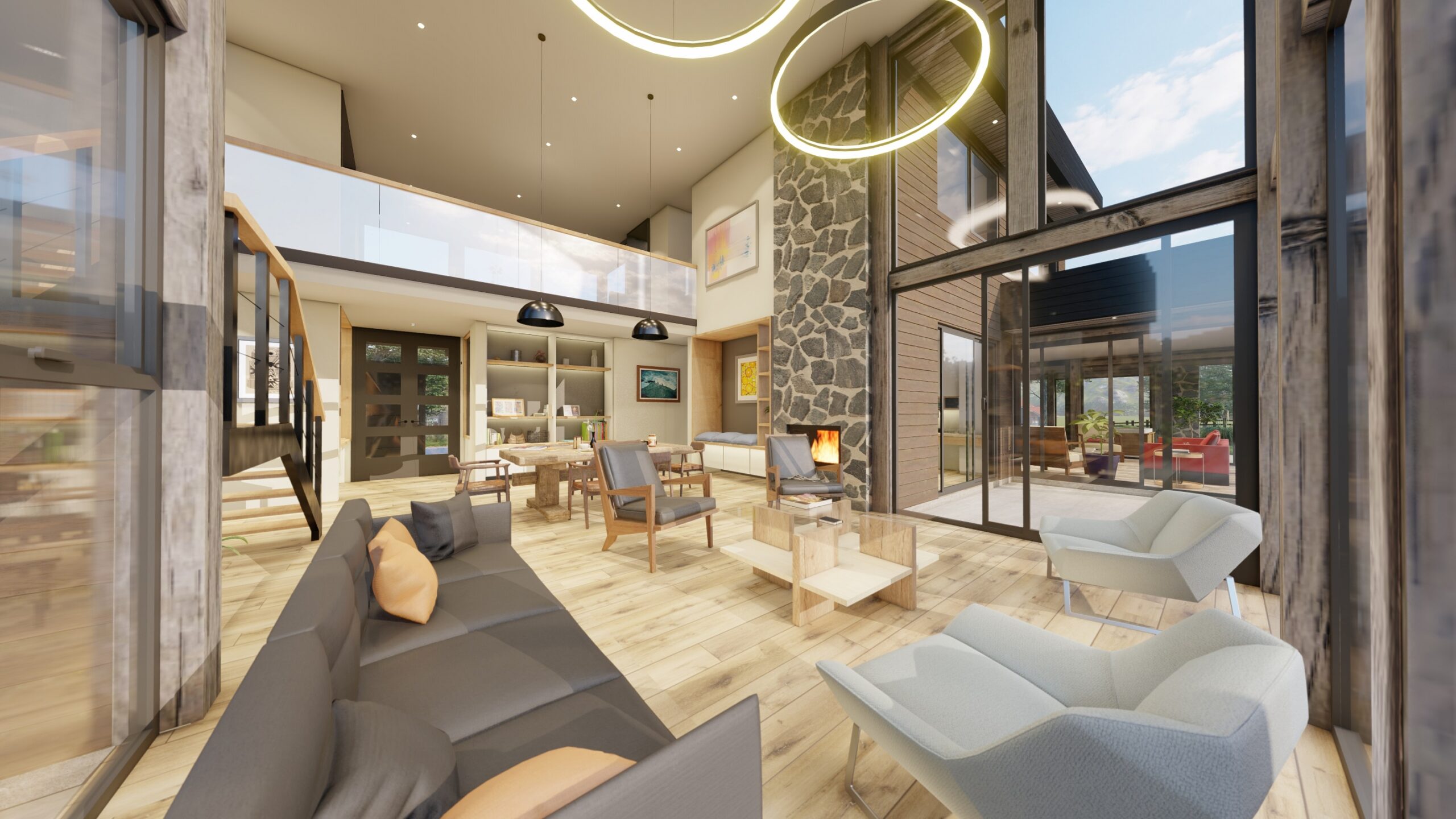 La arquitectura combina el estilo mediterráneo con líneas modernas y enmarcadas, logrando fachadas innovadoras que respetan la esencia del sur de Chile. En su interior, destaca una imponente doble altura y ventanales de acero revestidos en madera, que no solo realzan la amplitud y luminosidad, sino que también optimizan el consumo energético al mantener una climatización eficiente durante todo el año.