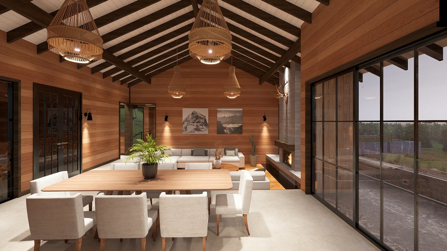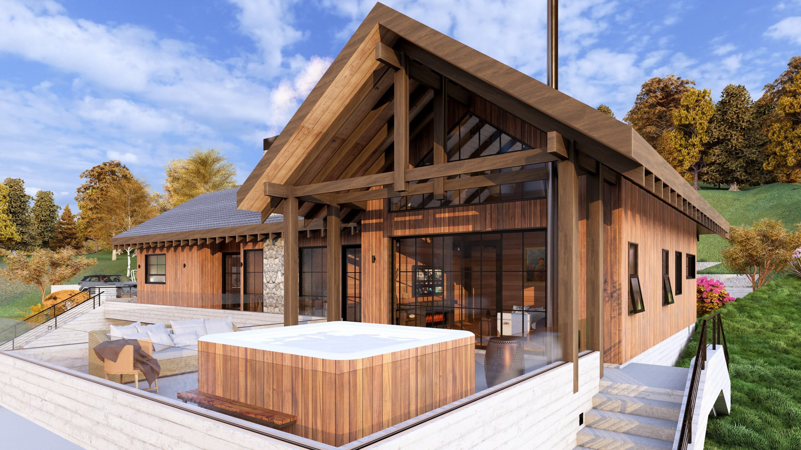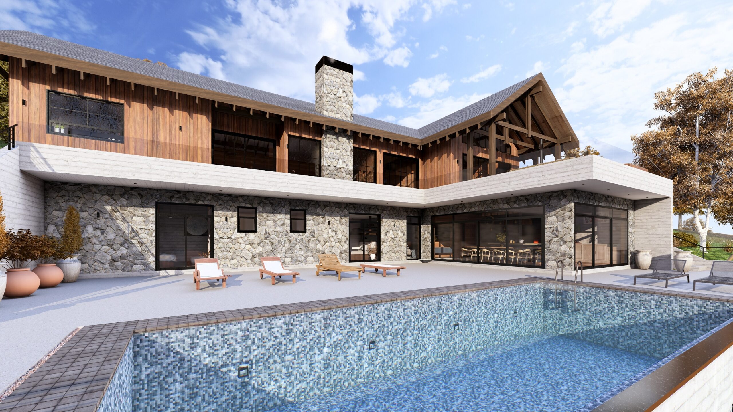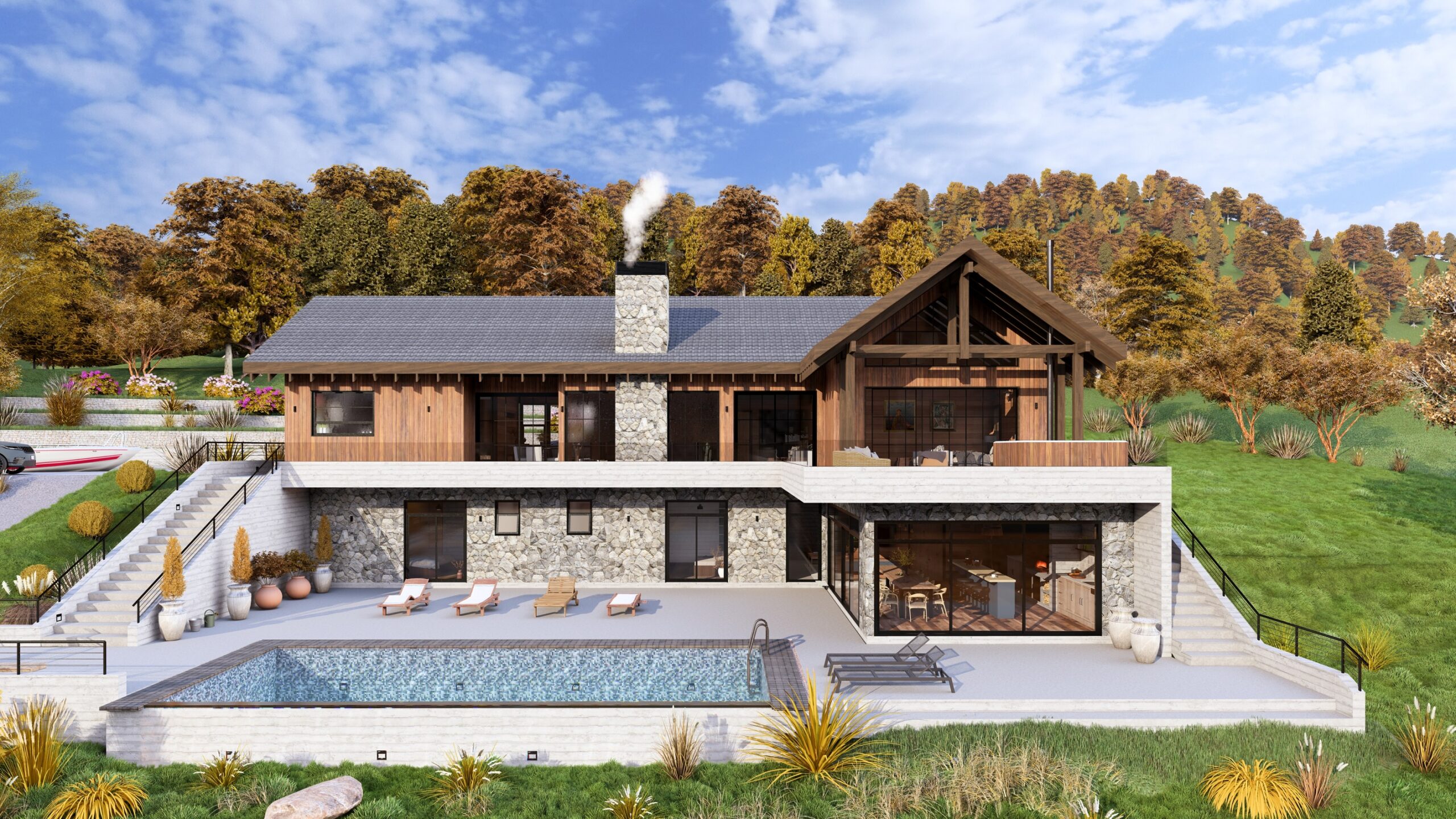 En su fachada, el proyecto emplea materiales tectónicos de mayor peso en la planta baja, simulando la solidez necesaria para sostener la estructura de madera del nivel superior. Este enfoque no solo aporta carácter a la vivienda, sino que también permite la creación de terrazas superiores que, a su vez, forman aleros para proteger las áreas de la piscina y el quincho.
