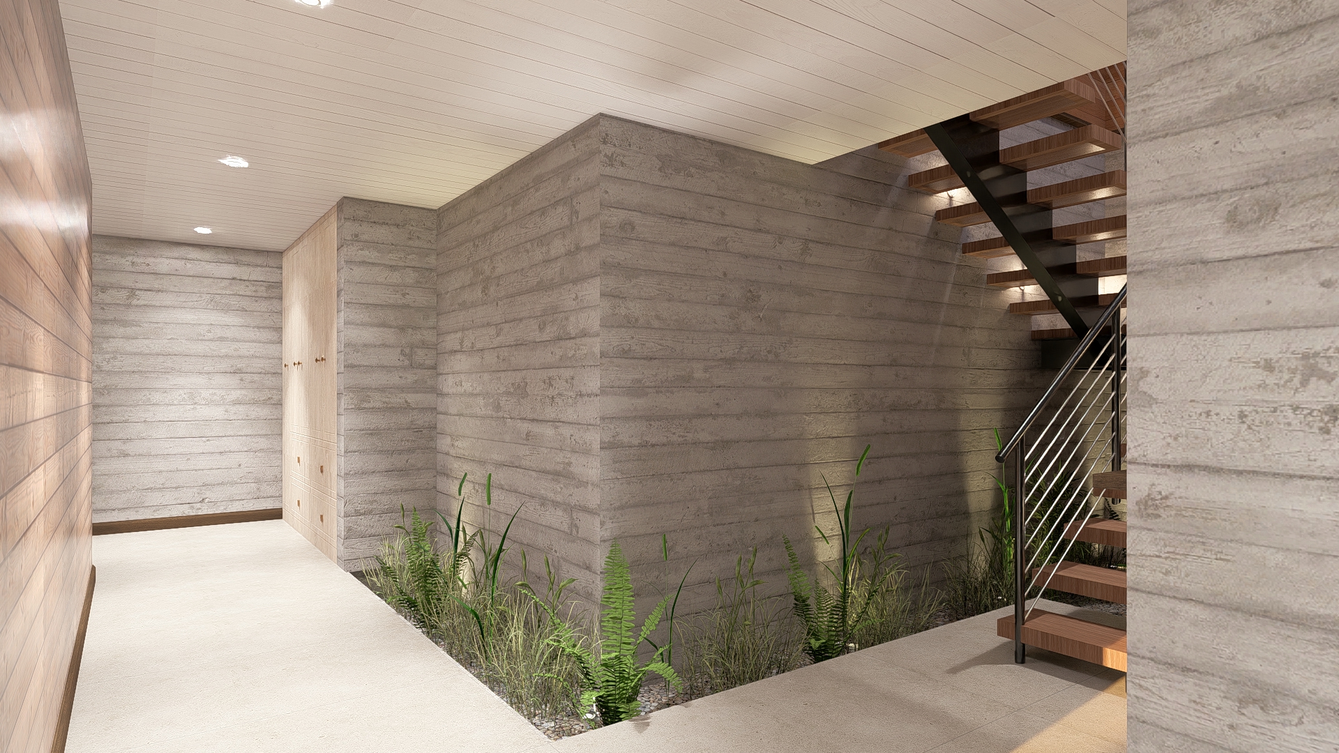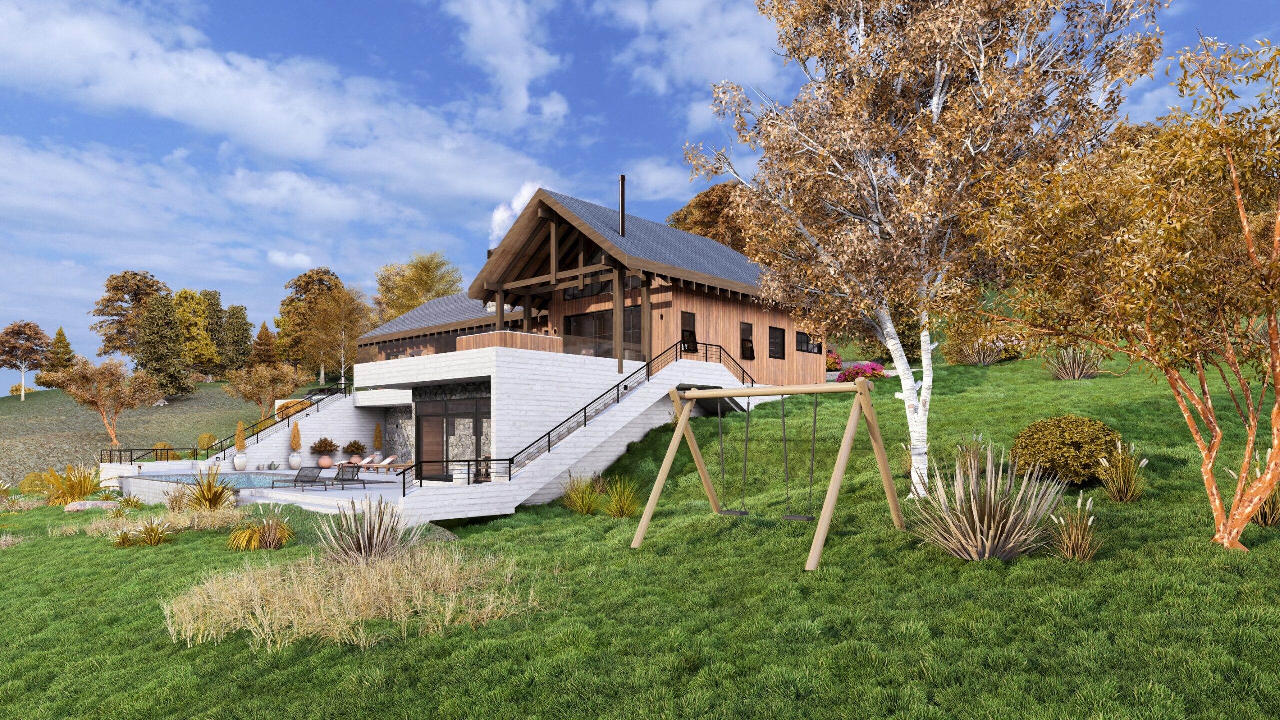 Su diseño distribuye la arquitectura en dos pisos, con un acceso principal en el nivel superior que conecta directamente con los espacios comunes del diario vivir, mientras que los dormitorios y quincho se encuentran en la planta baja.