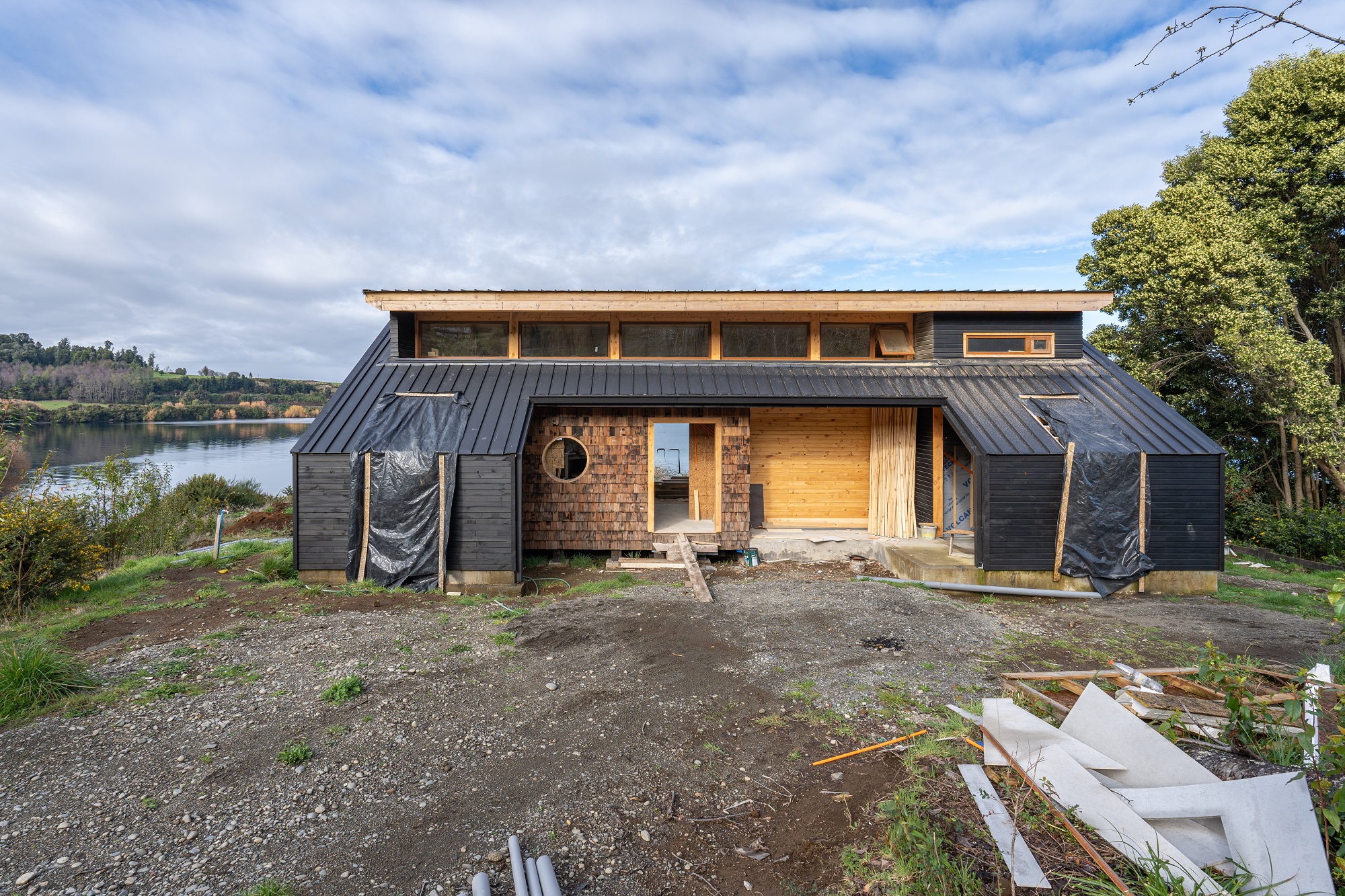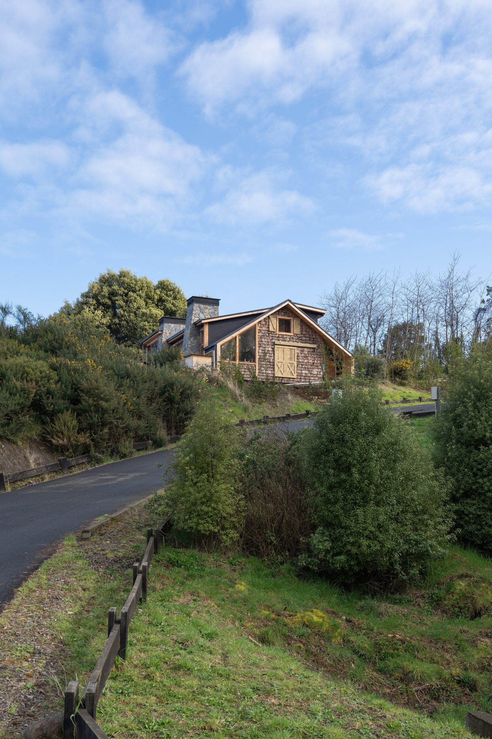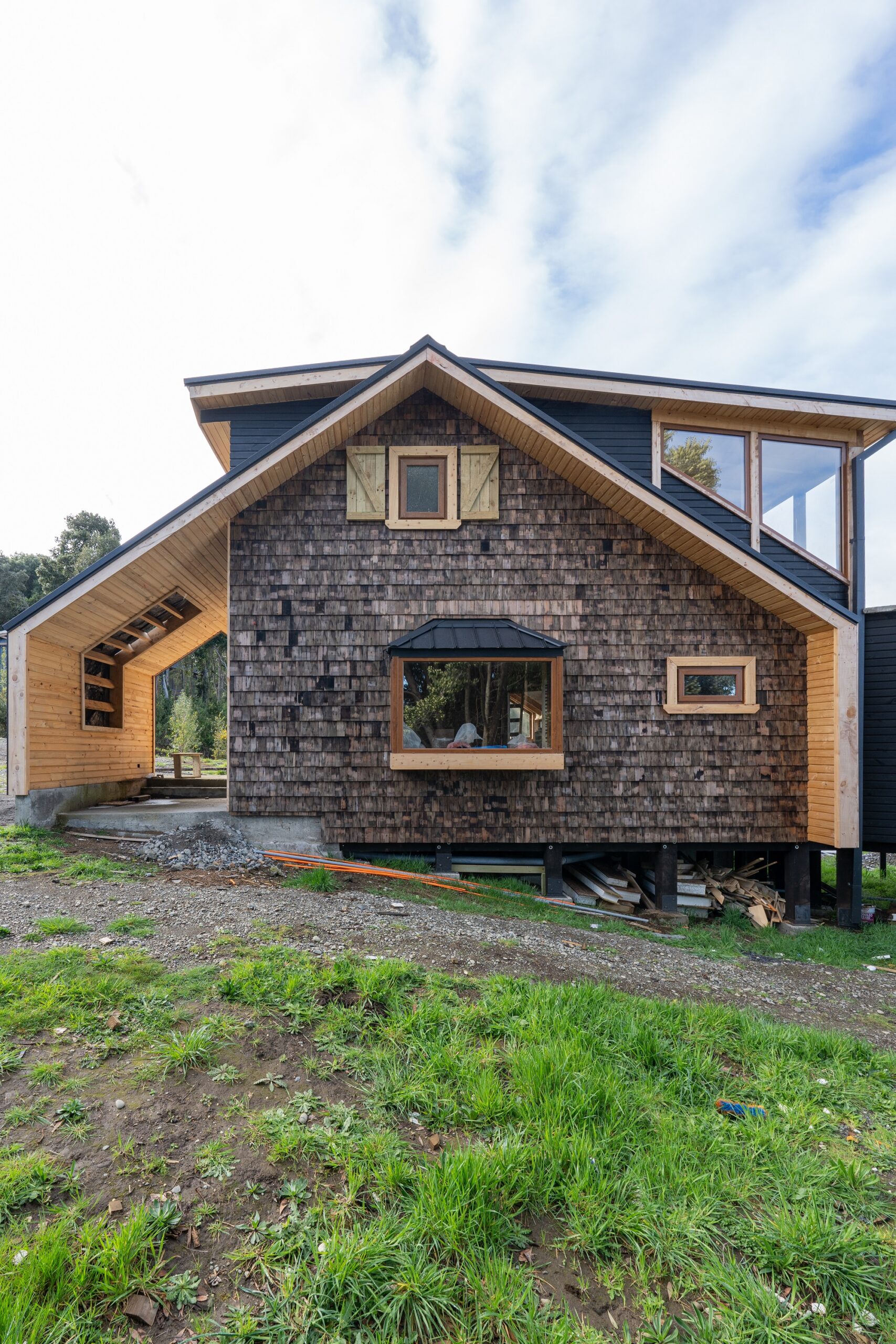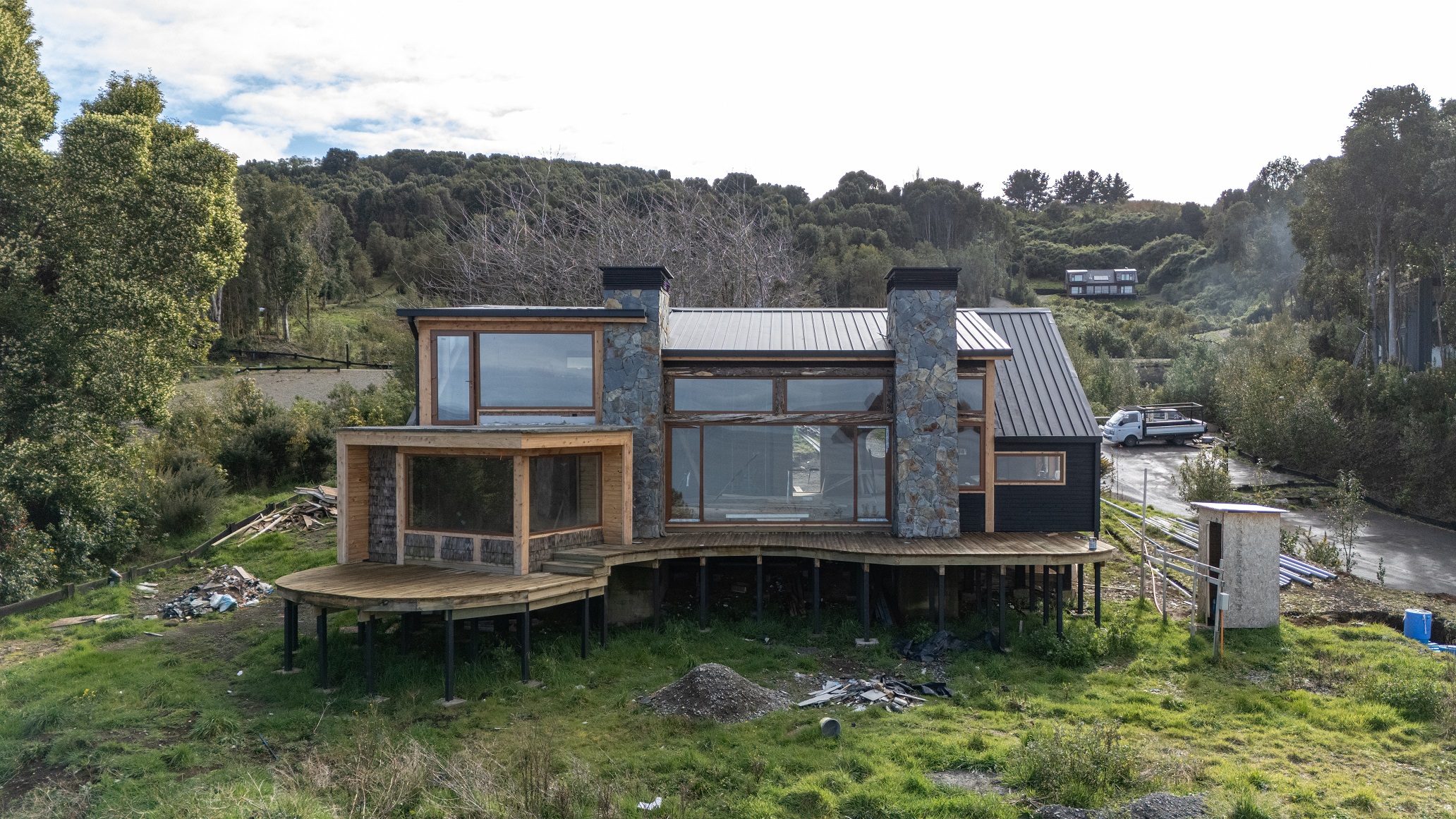 La Casa M-V, ubicada en la primera línea del lago Llanquihue, es un refugio sureño diseñado para desconectarse del bullicio de la vida urbana. Inspirada en los galpones tradicionales de la región, la vivienda combina un diseño rústico con toques contemporáneos, destacando el uso de tejas de alerce reciclado en sus fachadas y maderas robustas en los interiores.
