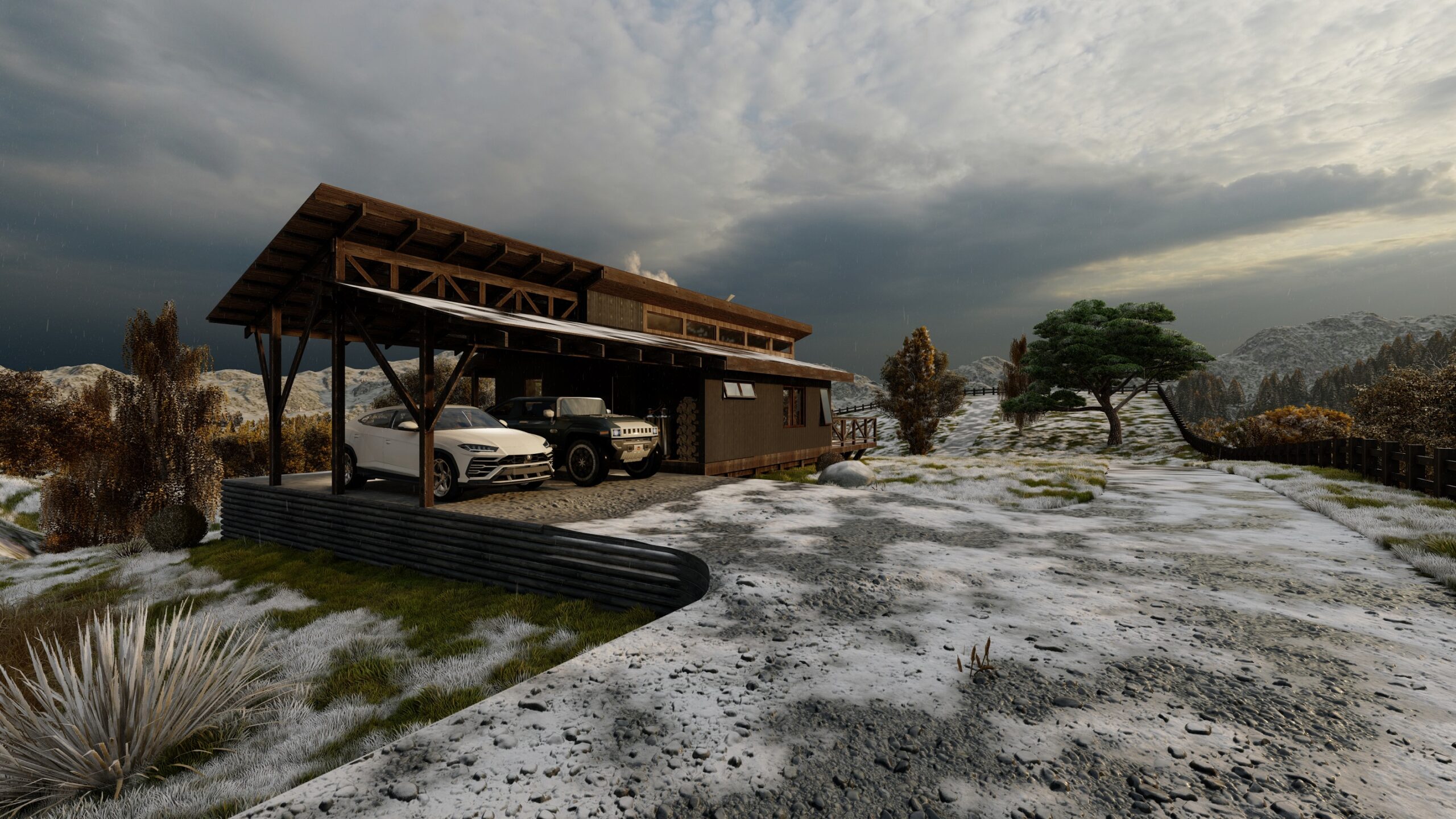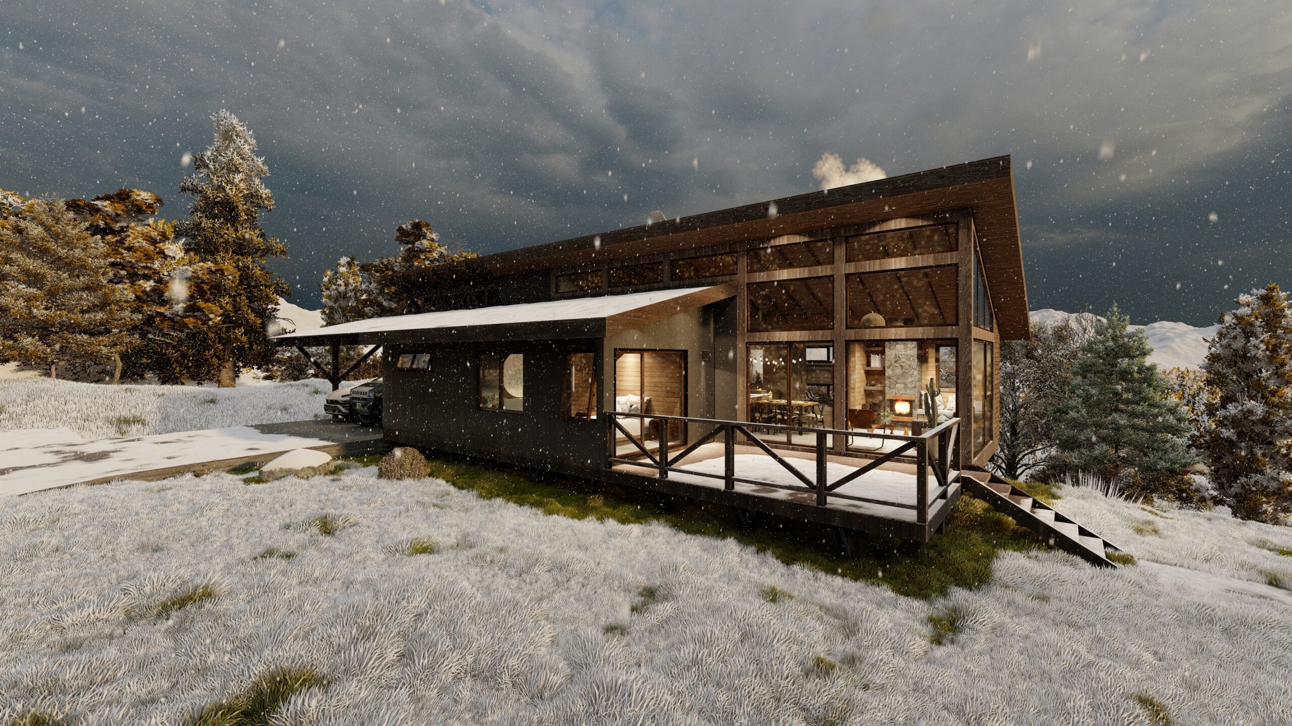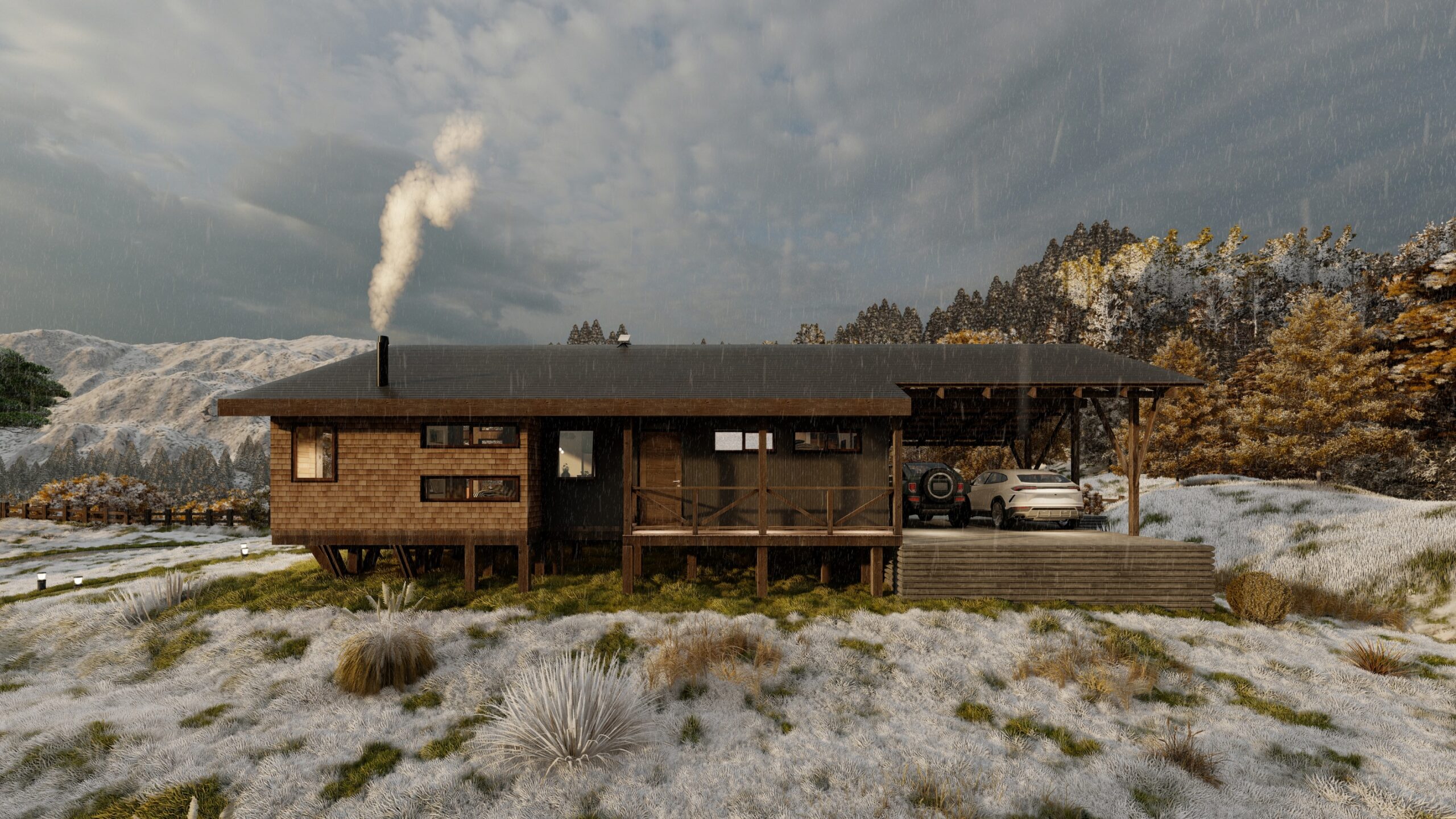 Refugio andino: Diseñado cerca de la alta montaña en la comuna de Melipeuco, este refugio es capaz de albergar a más de 10 personas en una volumetría eficiente de no más de 105 metros cuadrados.