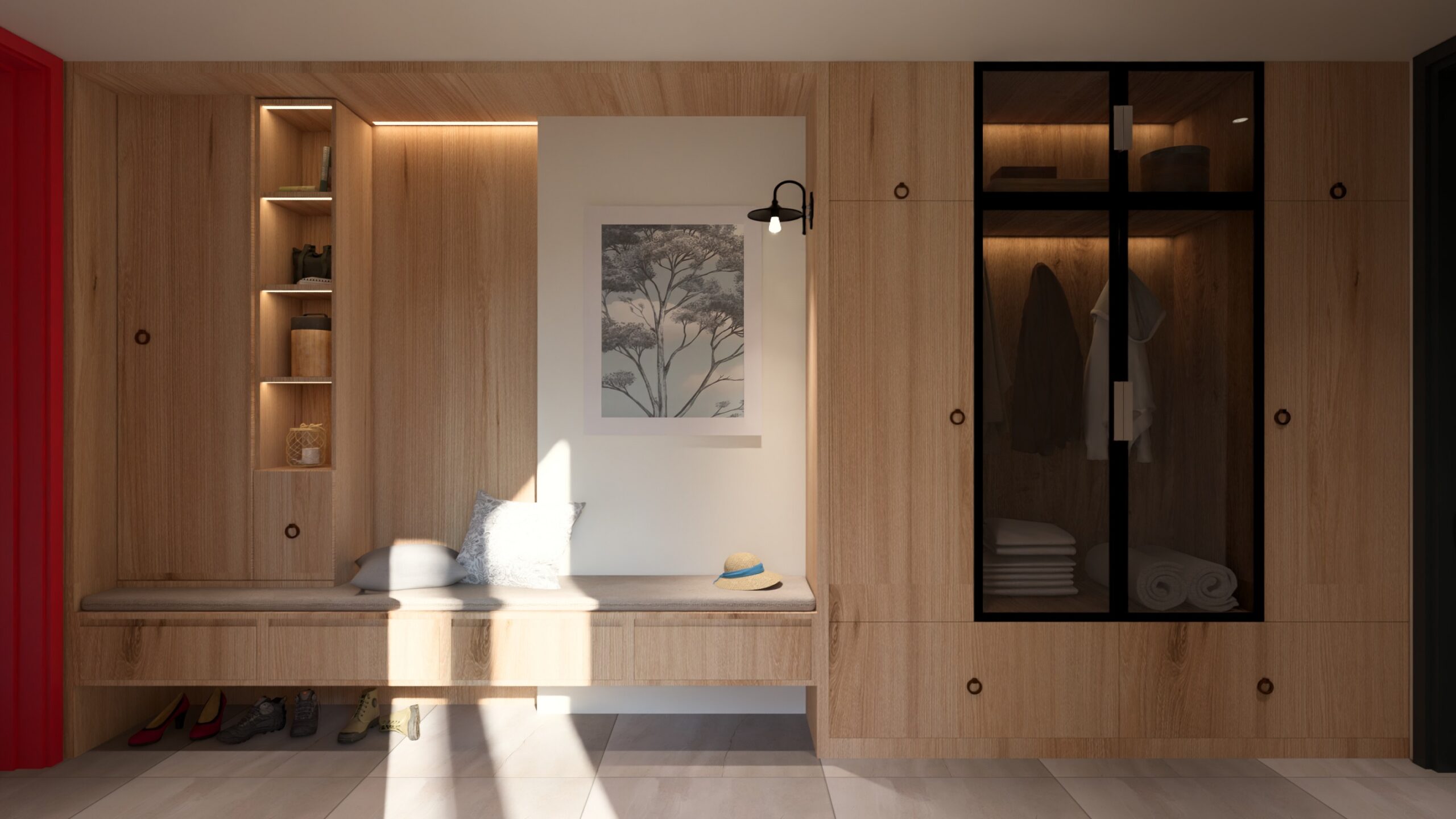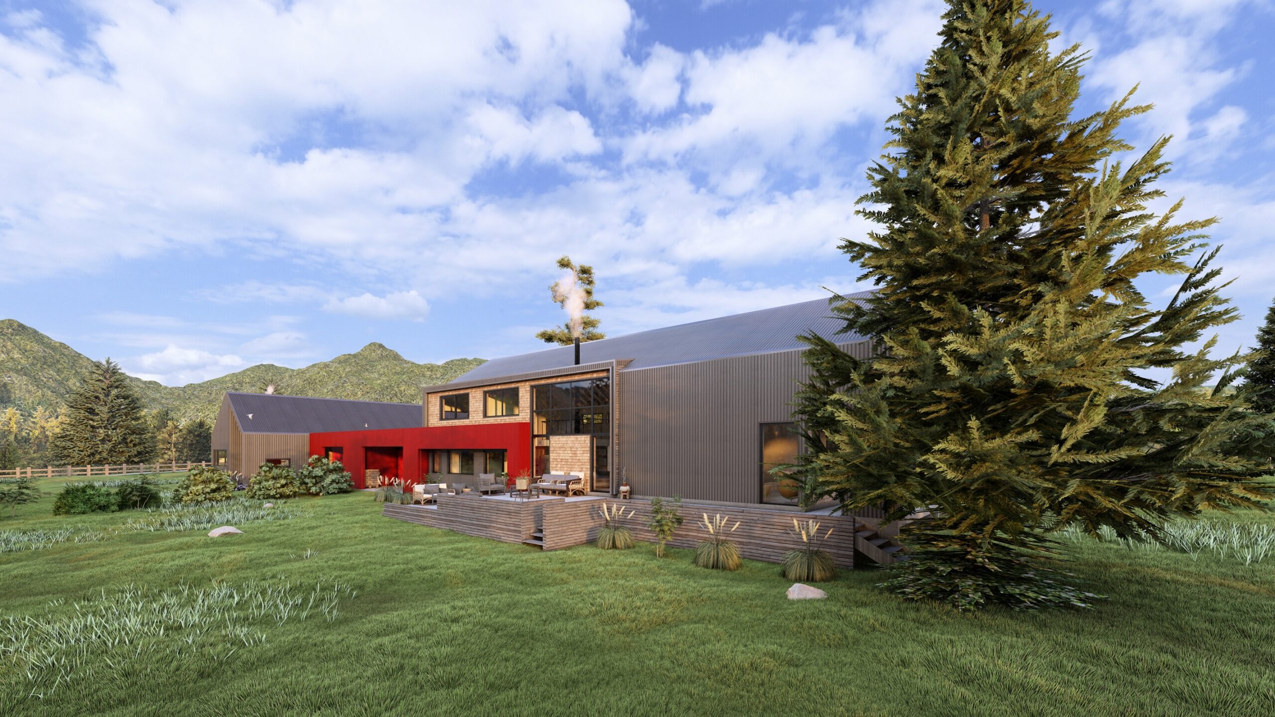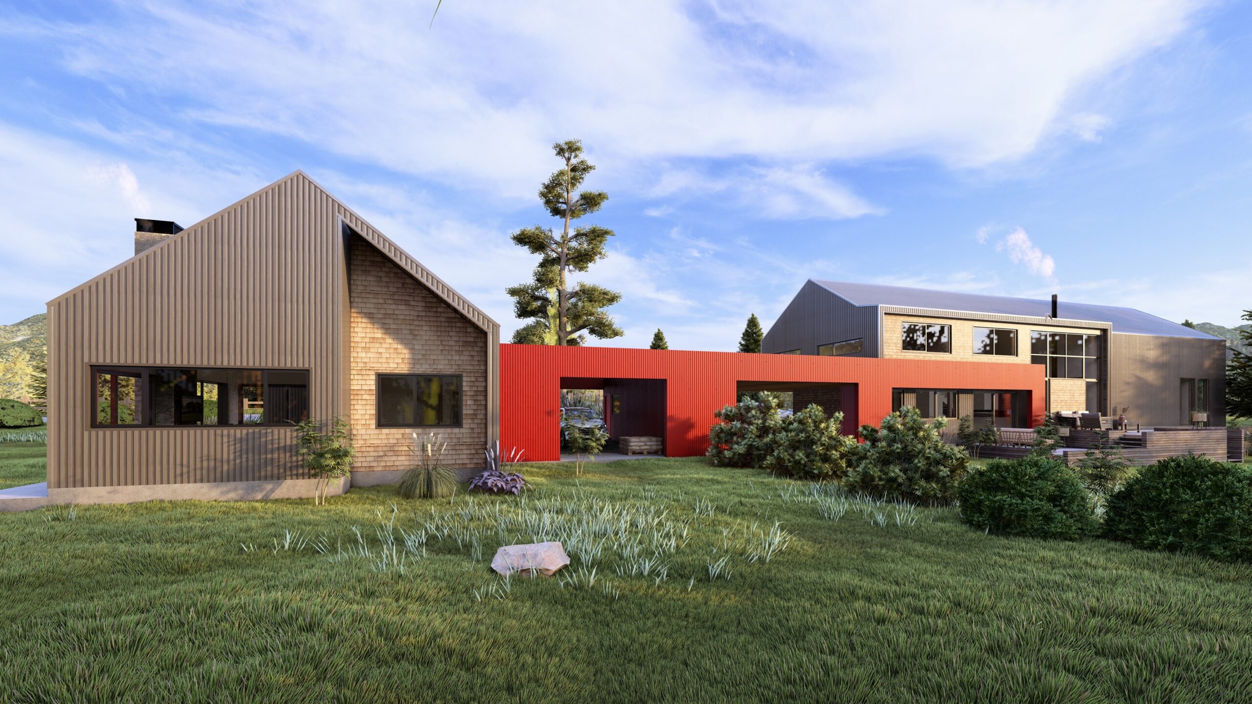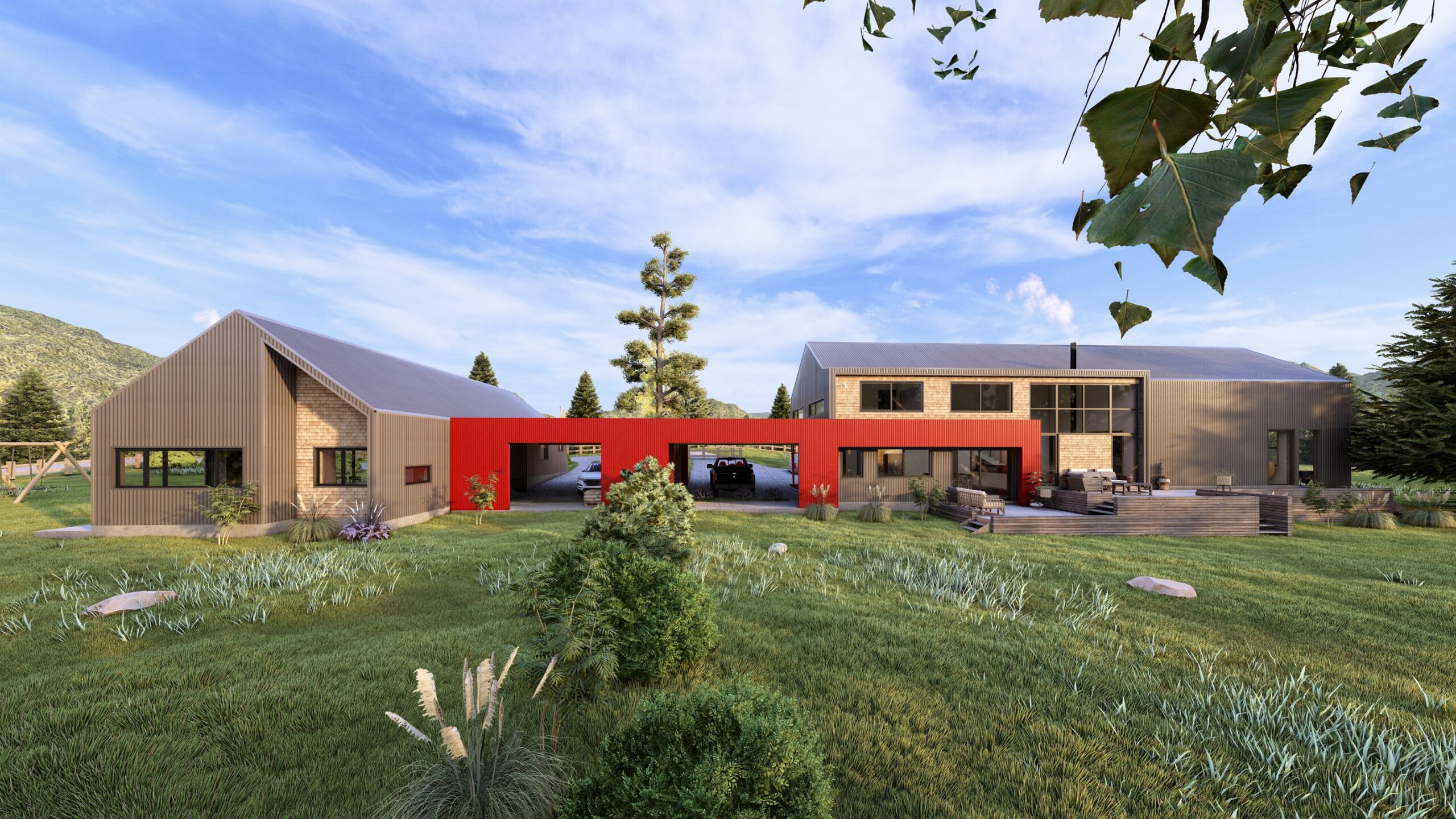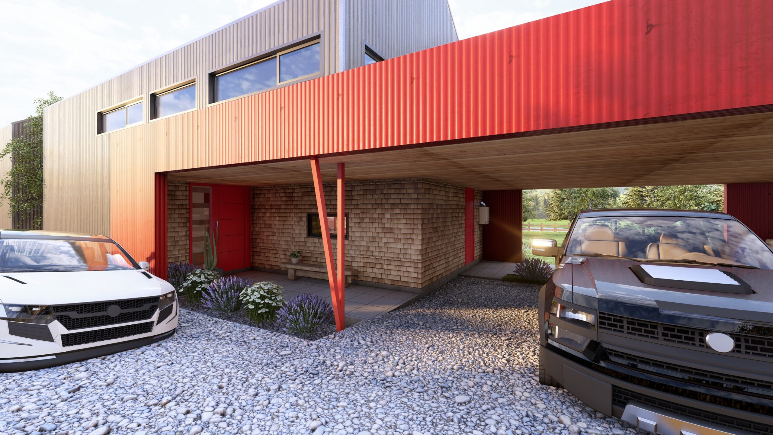 Cinta conectora: Conceptualmente, el proyecto plantea dos construcciones de vivienda unidas por un elemento conector que simula una cinta roja intensa, integrándose también en detalles como puertas y accesos para crear una identidad cohesiva.