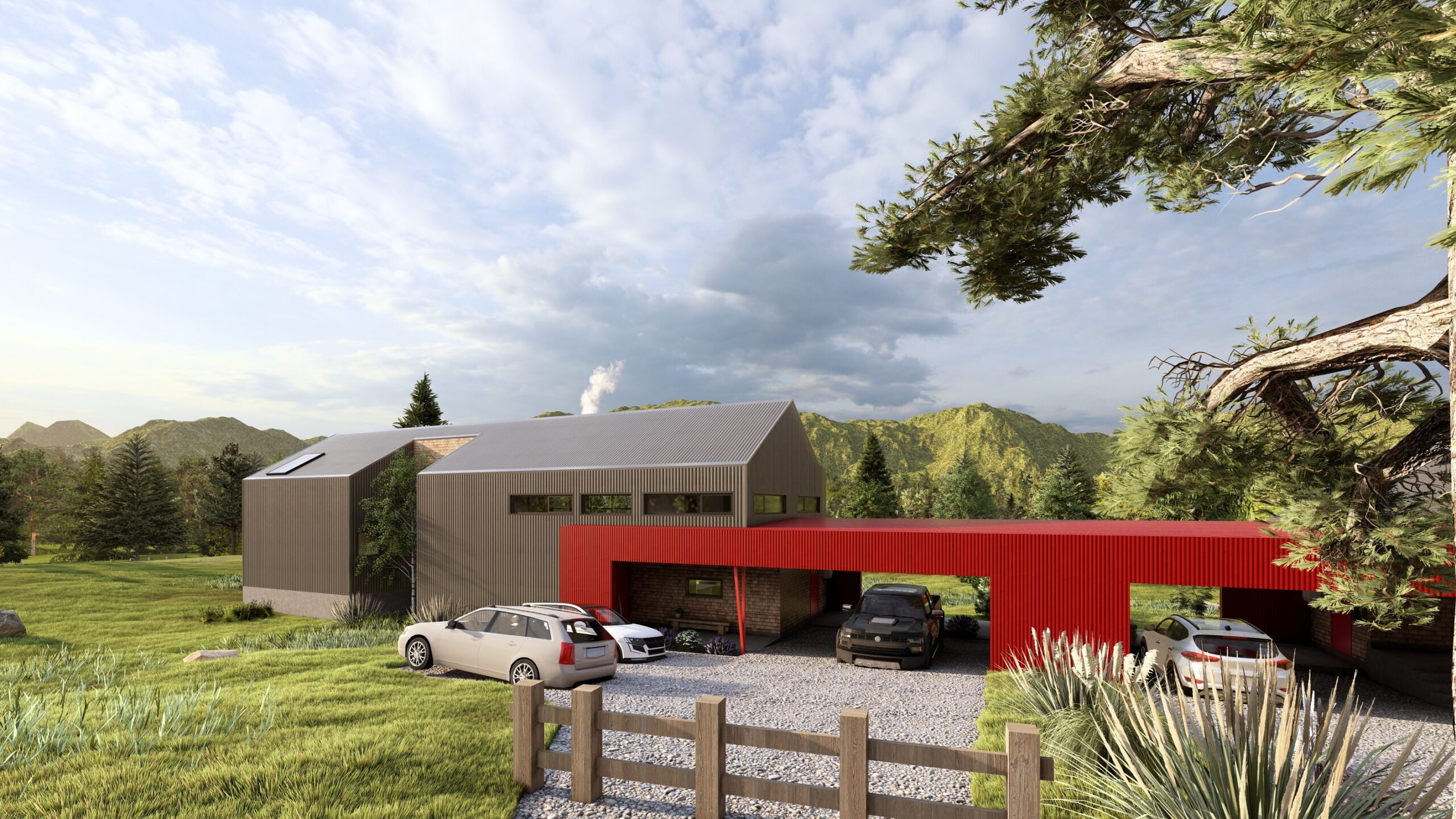 Ubicada en las cercanías de Puerto Varas, esta vivienda se compone de dos construcciones completamente independientes, separadas por un volumen central que alberga los estacionamientos, bodegas y salas técnicas. Este elemento destaca con un revestimiento rojo intenso, contrastando con los tonos grisáceos de las viviendas, aportando carácter e identidad al conjunto arquitectónico.