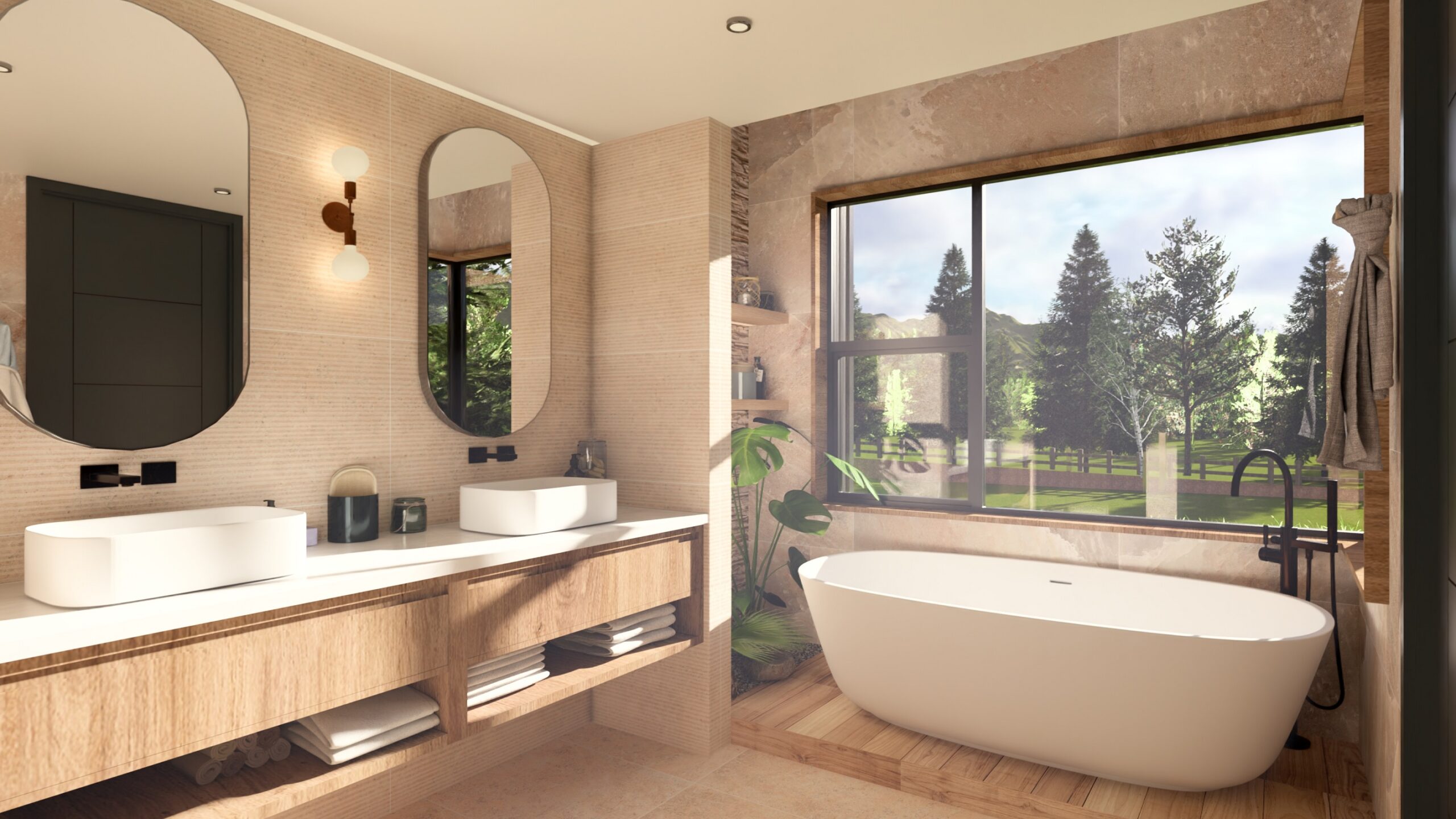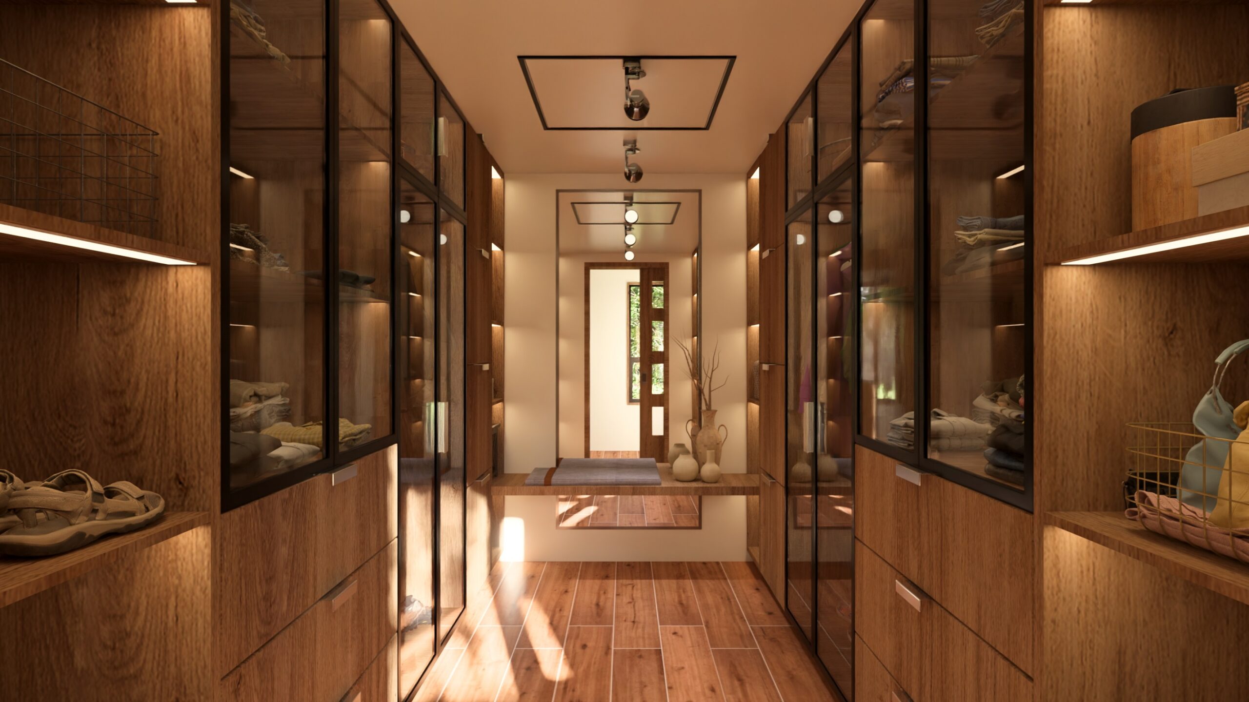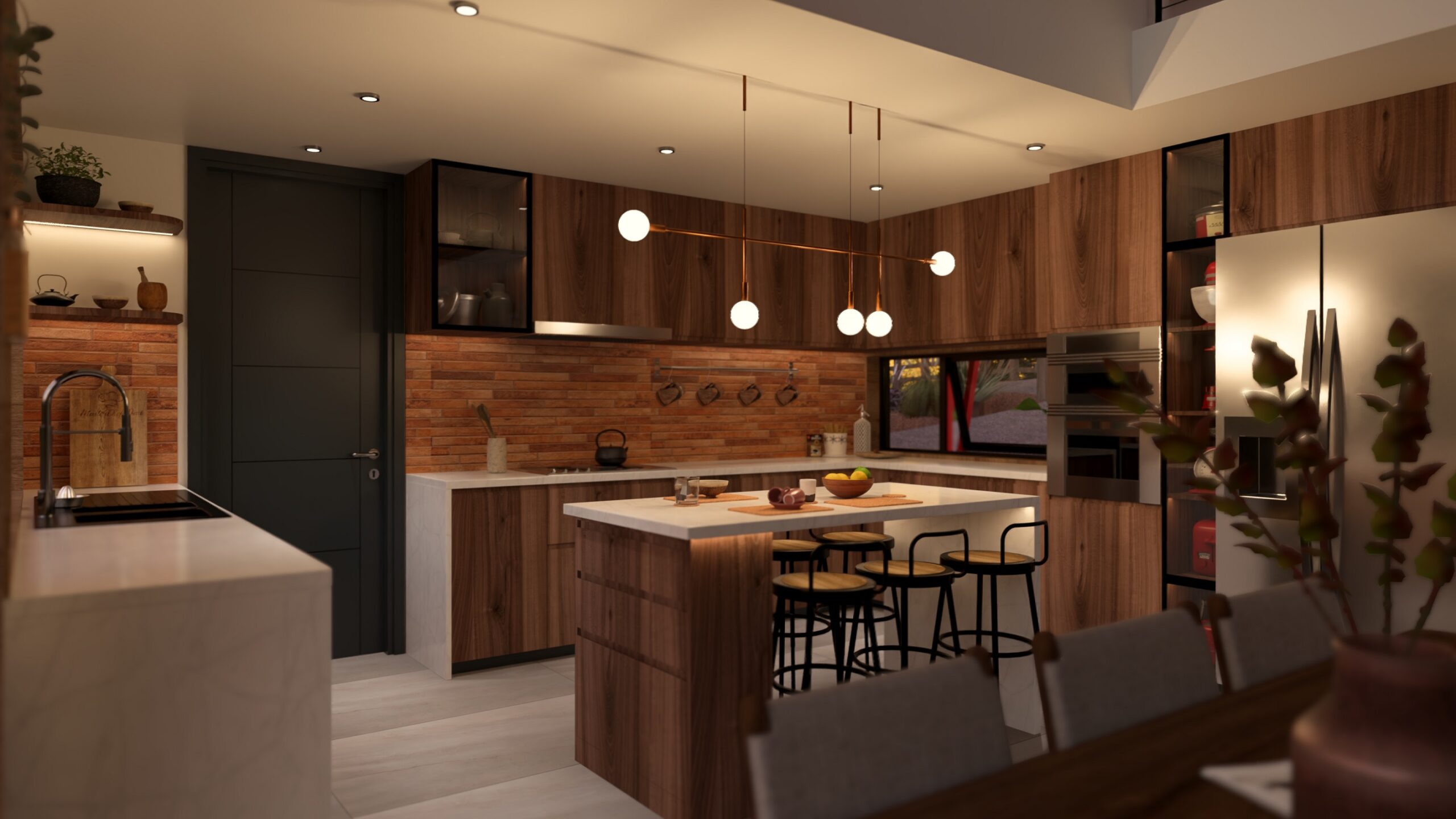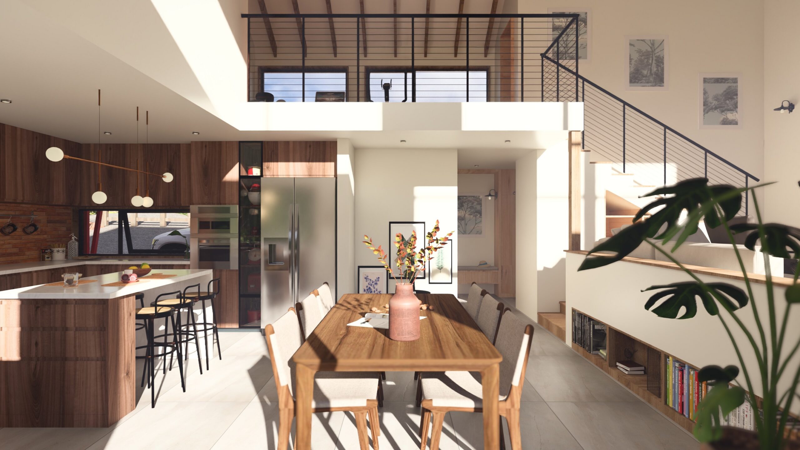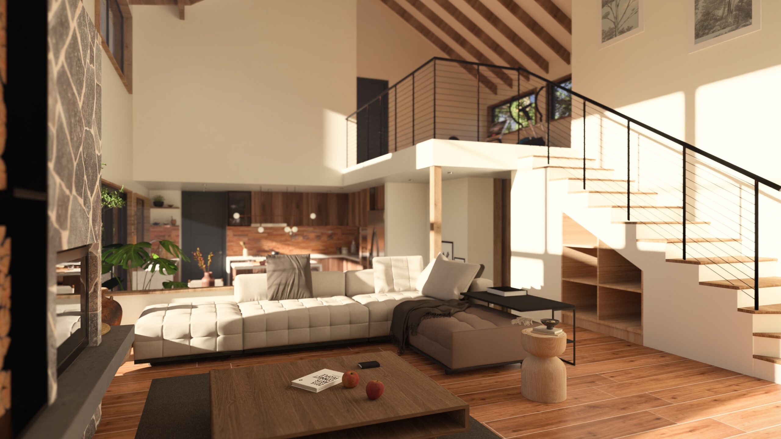 El interiorismo combina un estilo moderno con toques rústicos, destacando vigas expuestas en los altos cielos que aportan calidez y una sensación de amplitud, creando un ambiente acogedor y funcional para sus habitantes.