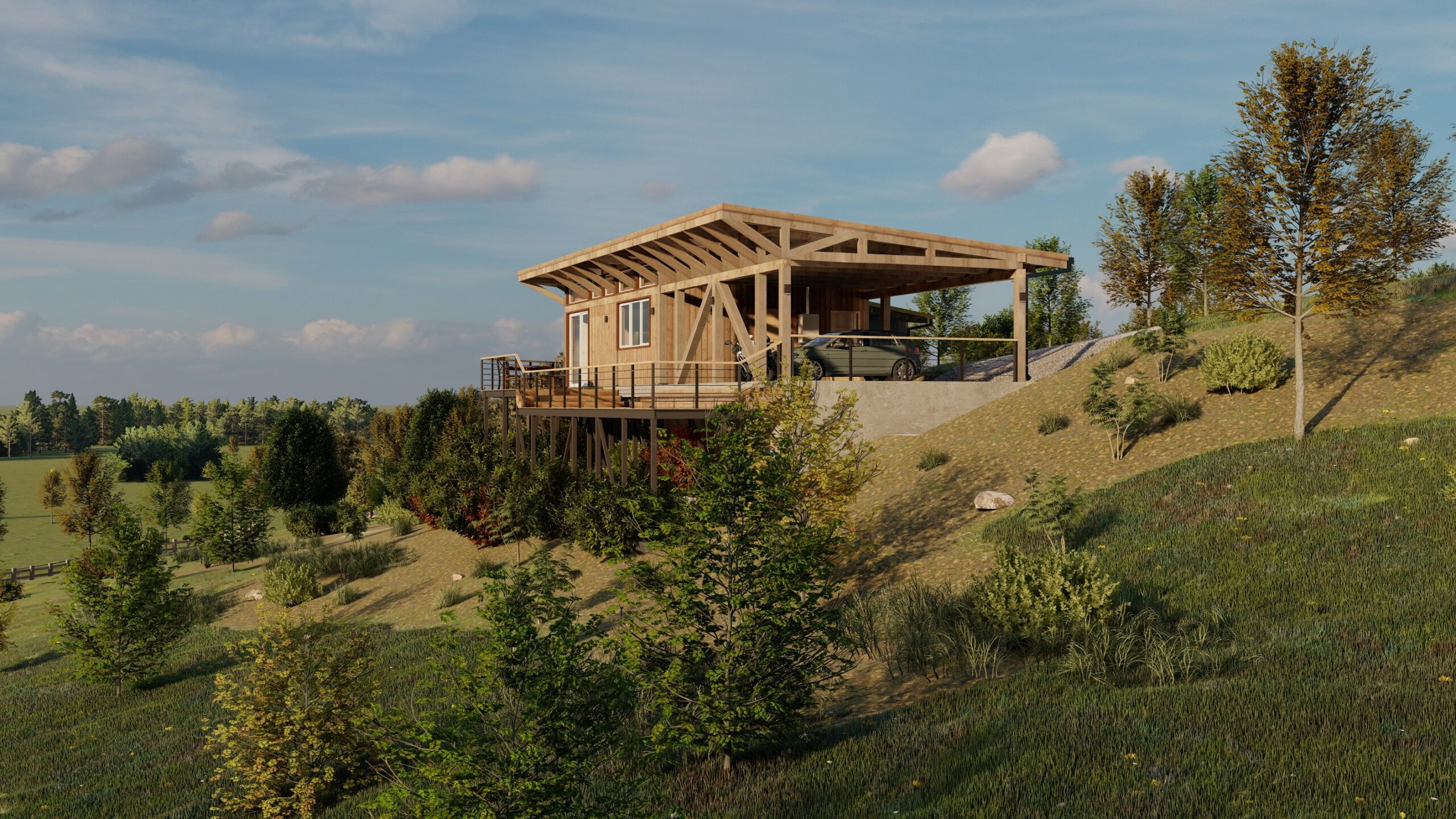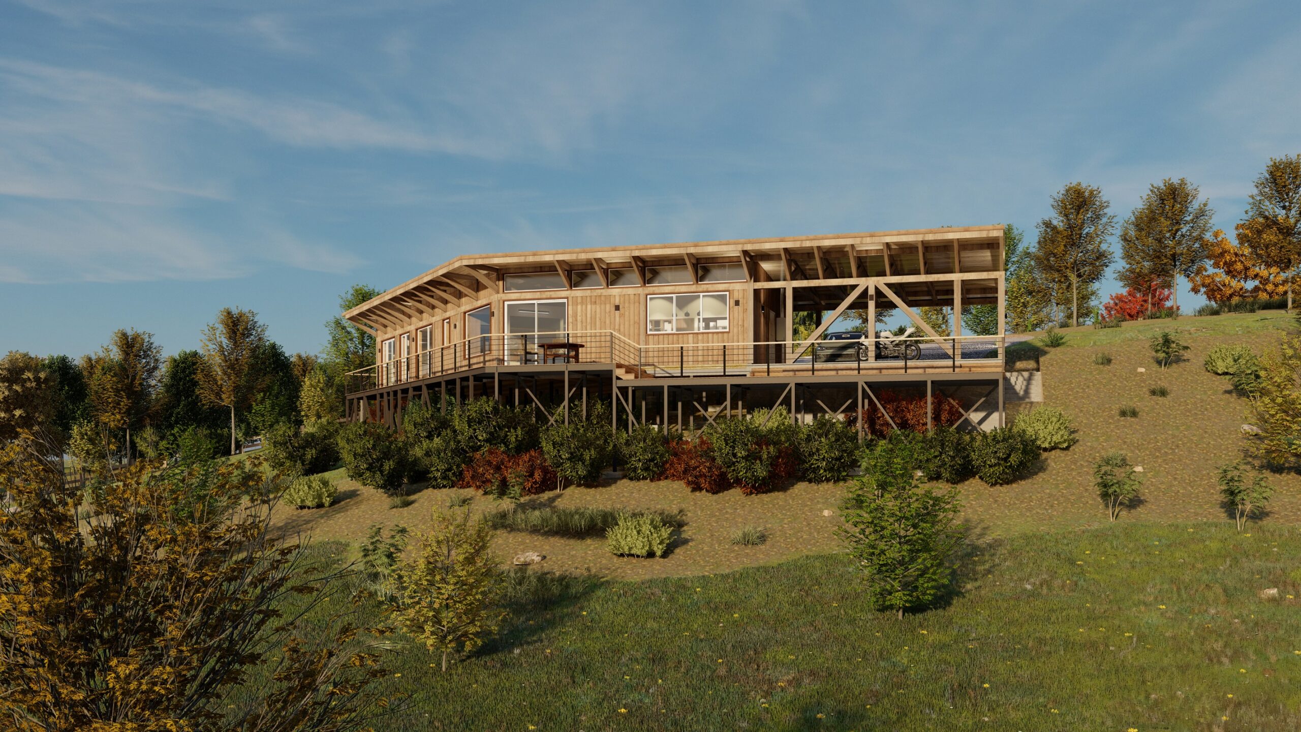 La vivienda se asienta sobre una pendiente inclinada dentro de una parcelación despejada, solucionando este desafío mediante una estructura de acero y losa colaborante que asegura estabilidad y funcionalidad. Su diseño refleja un carácter rústico gracias a la elección de materiales exteriores que destacan su conexión con el paisaje, mientras que su distribución angular optimiza tanto la habitabilidad como la interacción con el entorno.