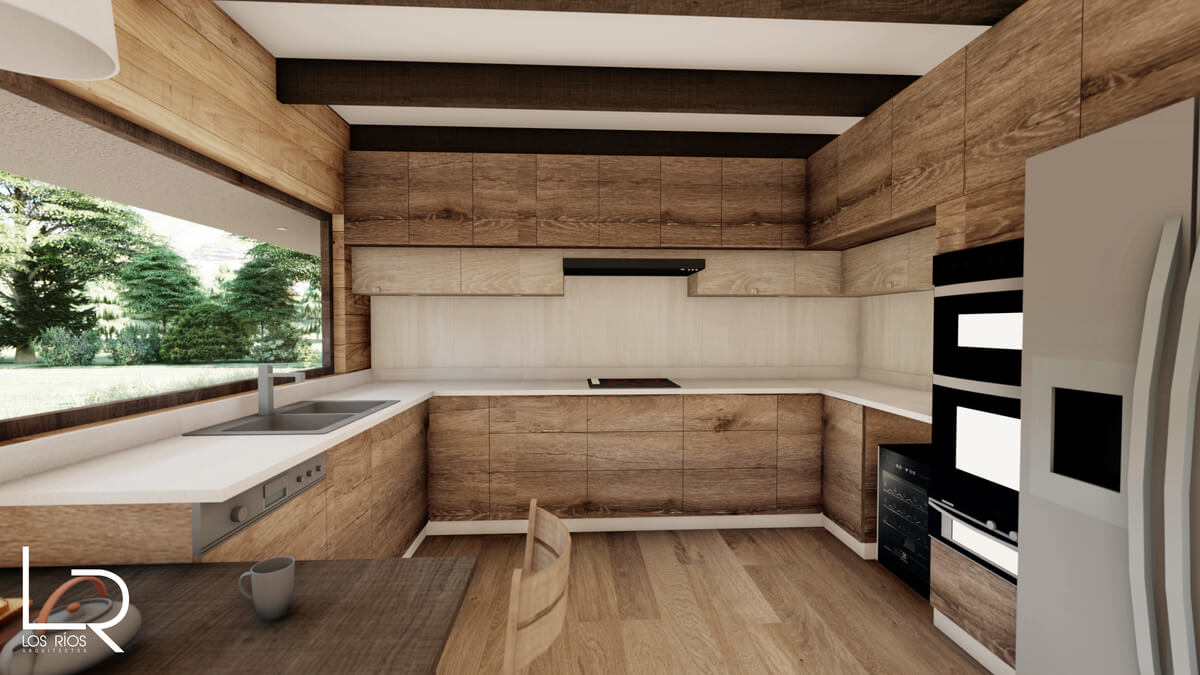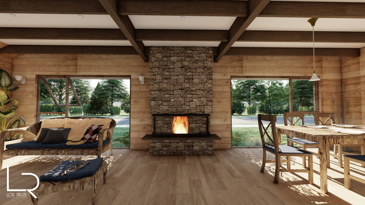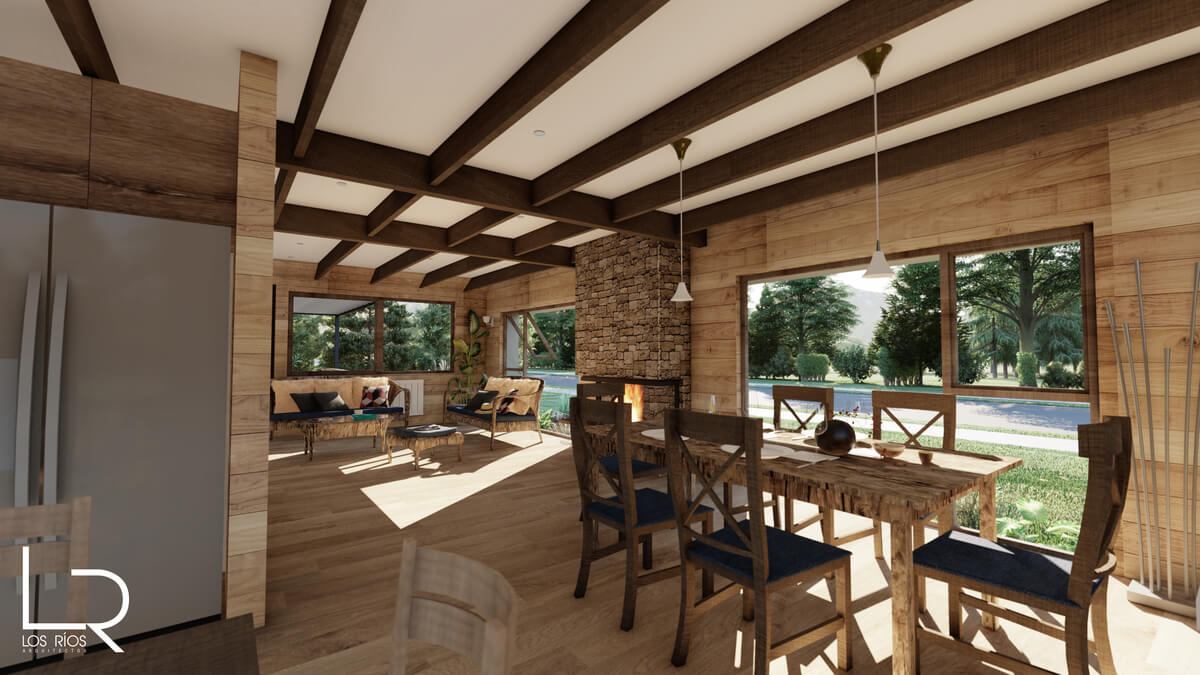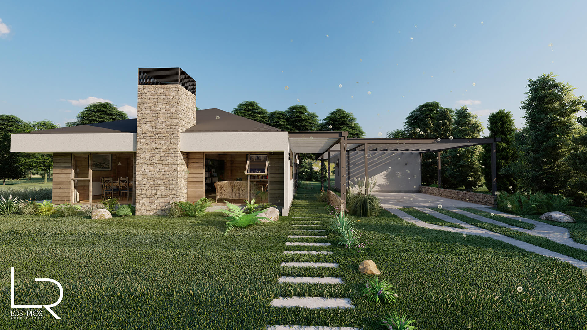 La casa se organiza en dos volúmenes claramente diferenciados: el primero, destinado a las áreas de uso cotidiano como estar, comedor y dormitorios; el segundo, enfocado en los servicios y actividades complementarias como estacionamiento, talleres y quincho. Esta separación permite aislar las actividades domésticas de las labores más prácticas, garantizando un flujo de vida ordenado y confortable dentro del hogar.