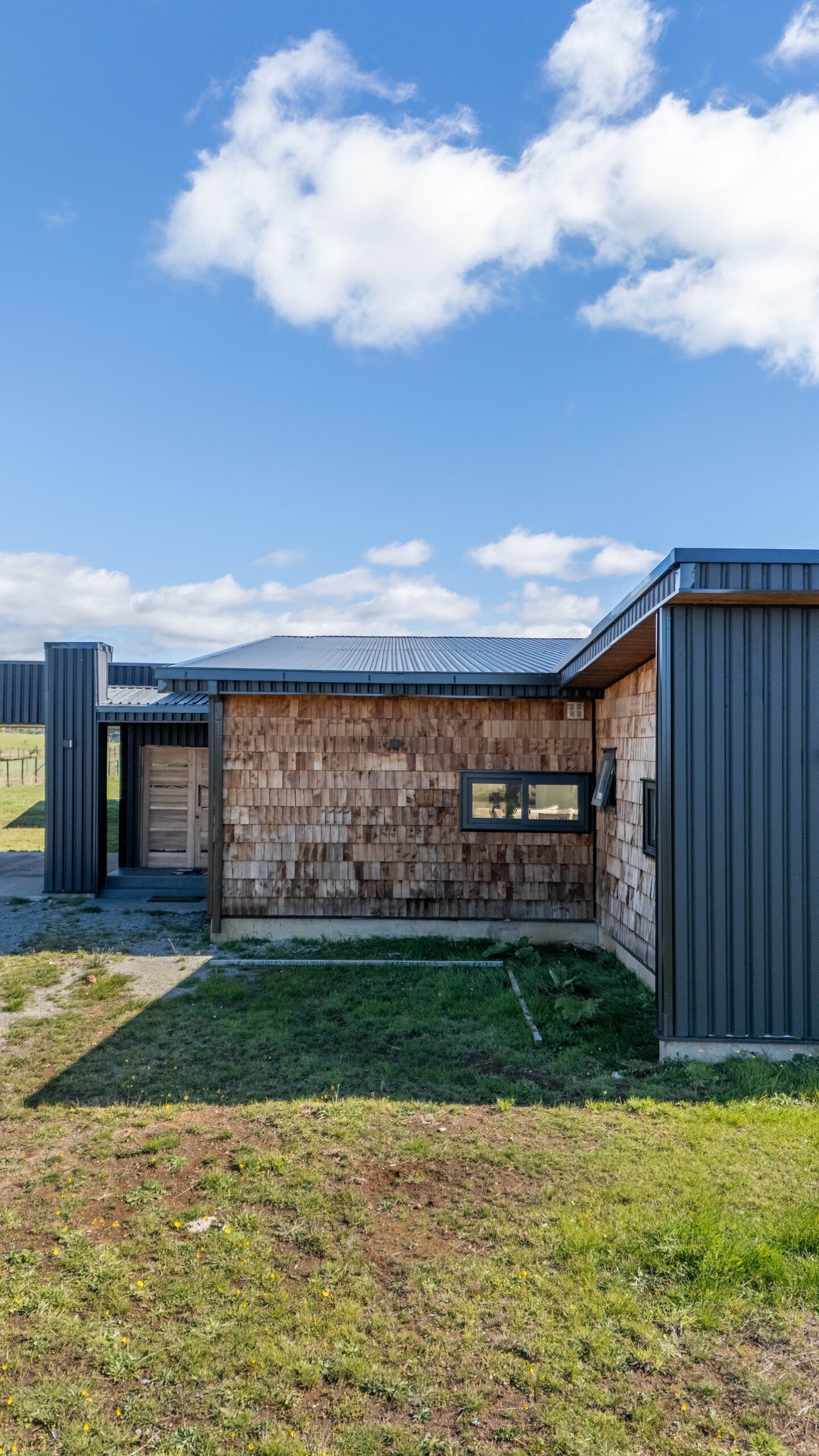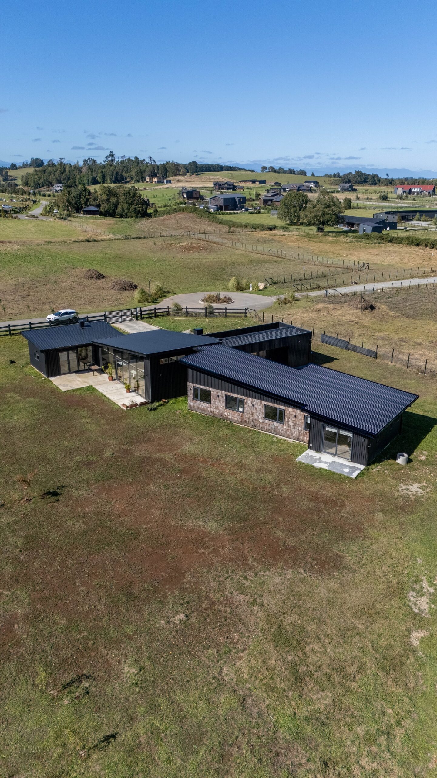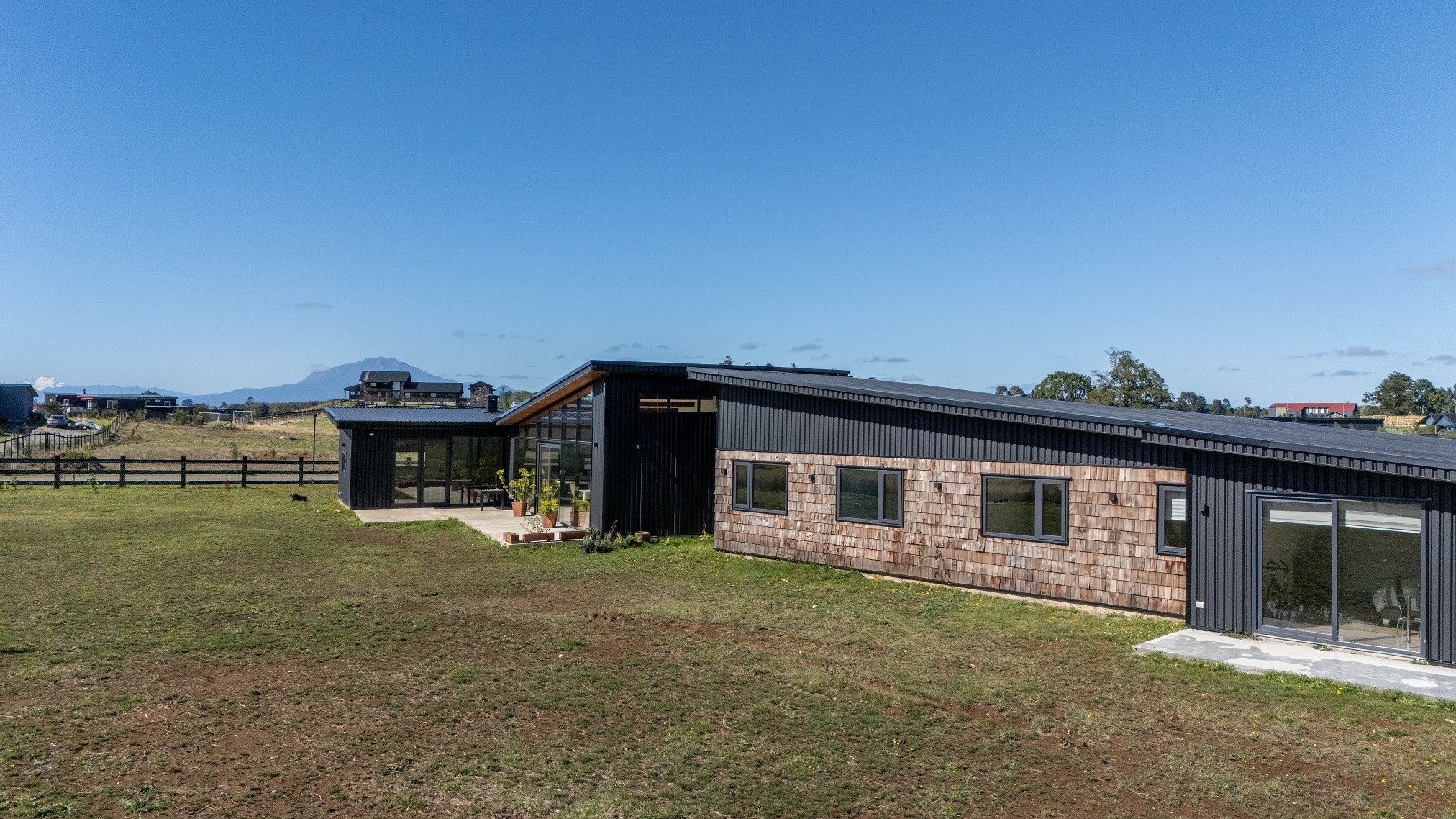 La casa destaca por su diseño de arquitectura moderna a una agua, integrando estratégicamente un muro cortina que permite capturar la esencia del sur a través de sus amplias vistas. Las tejuelas de madera aportan calidez y tradición, mientras que el zinc negro mate ofrece un contraste contemporáneo y resistencia a las condiciones climáticas.