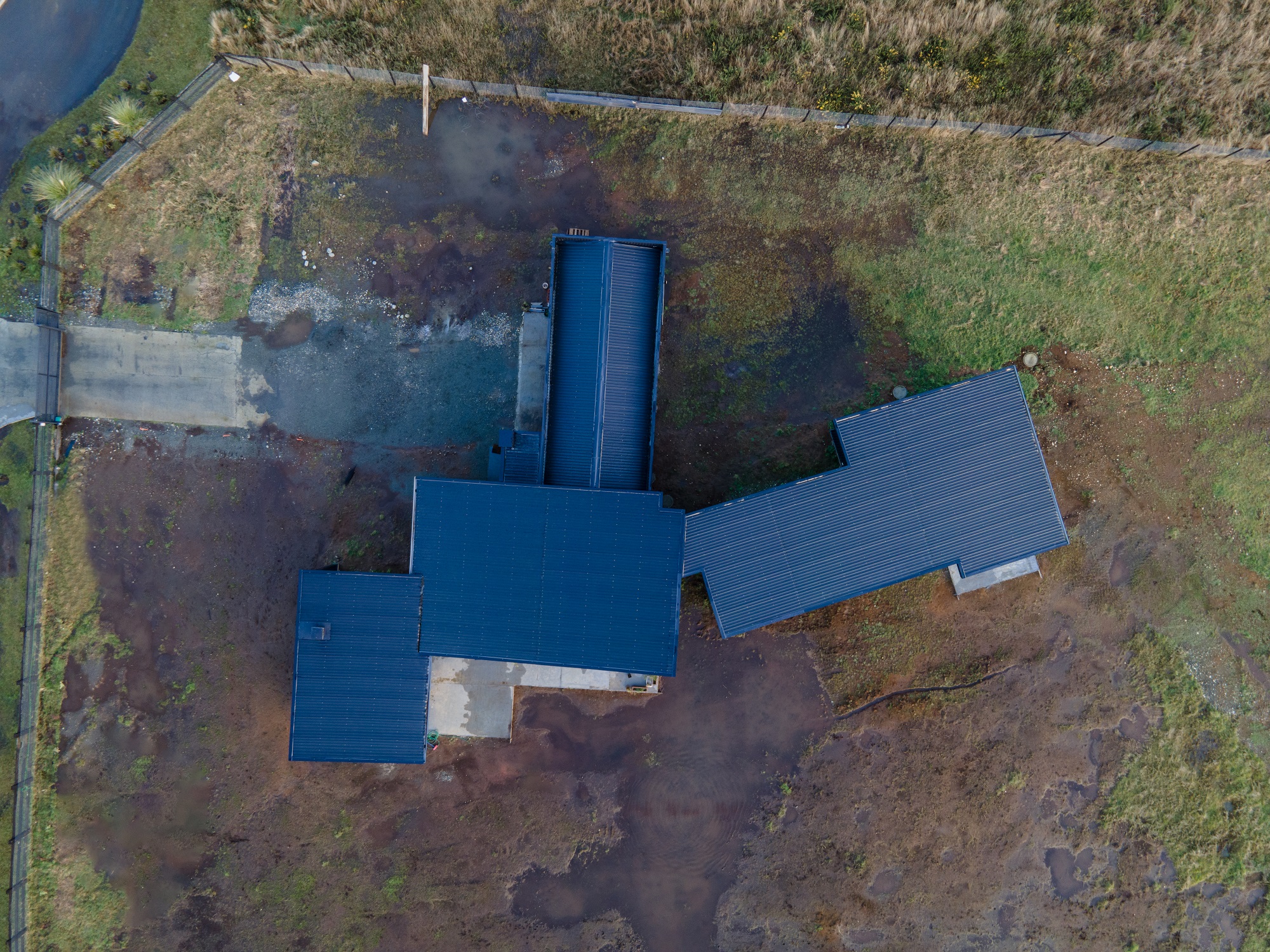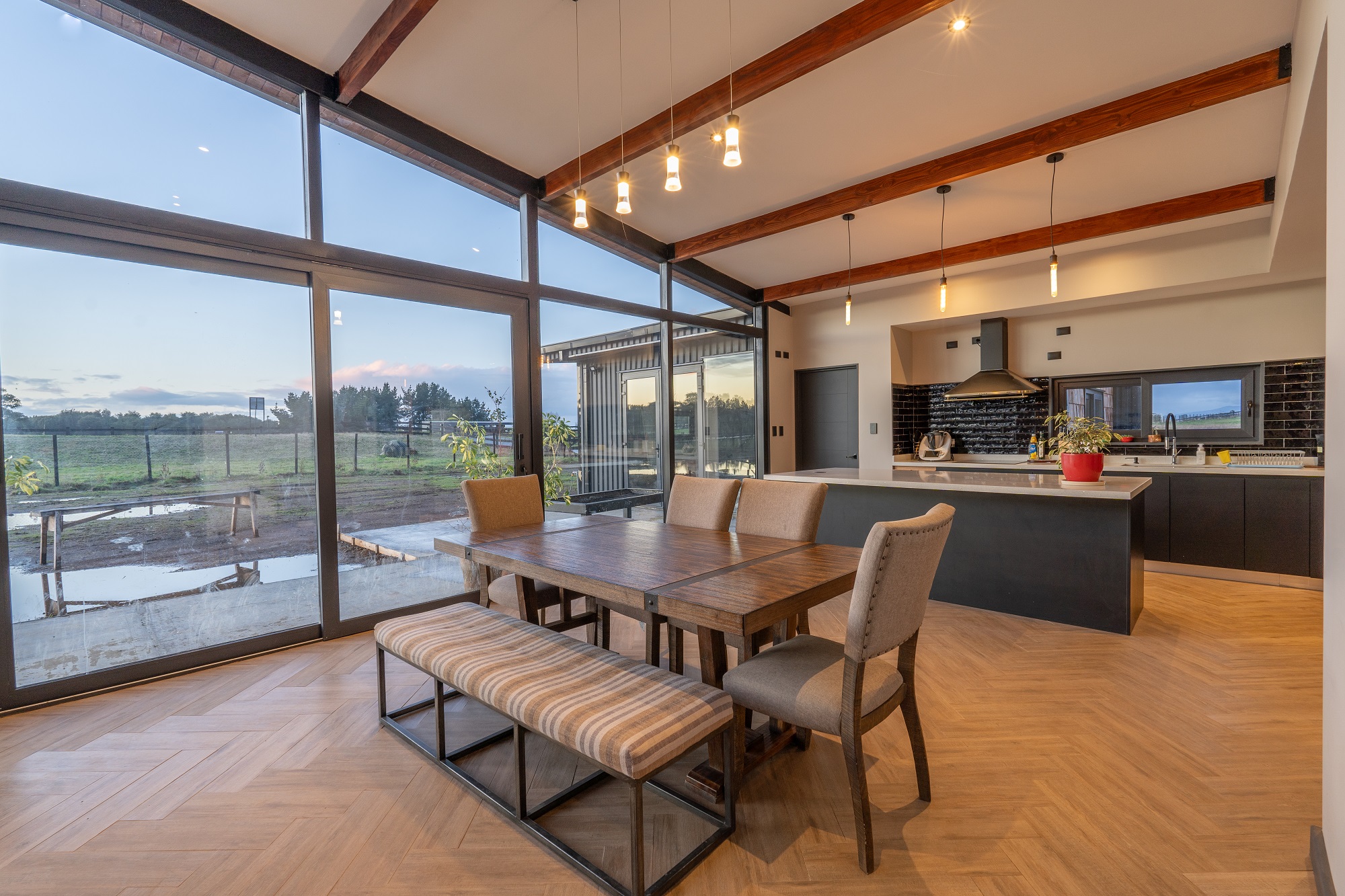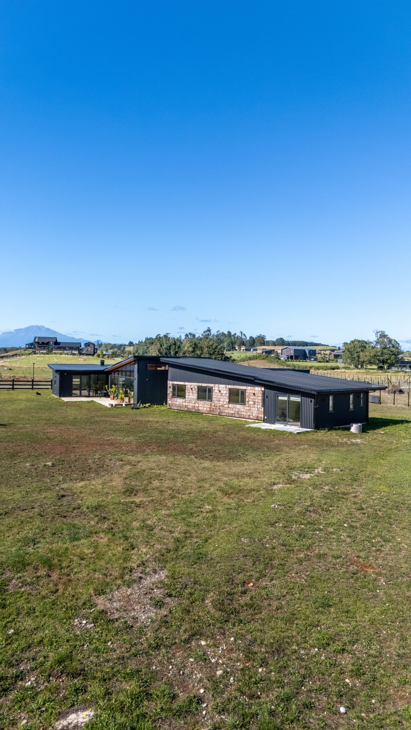 La casa destaca por su diseño de arquitectura moderna a una agua, integrando estratégicamente un muro cortina que permite capturar la esencia del sur a través de sus amplias vistas. Las tejuelas de madera aportan calidez y tradición, mientras que el zinc negro mate ofrece un contraste contemporáneo y resistencia a las condiciones climáticas.